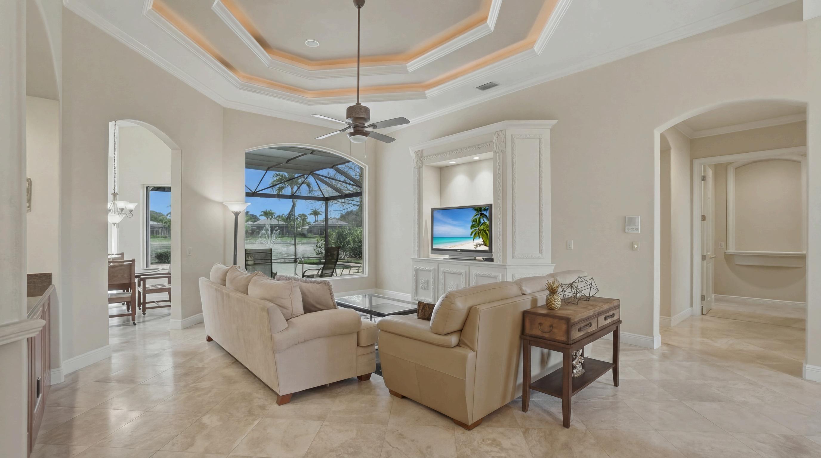 This stunning residence offers a spacious open floor plan with 2,578 square feet under air, featuring 3 bedrooms plus a den, 3.5 bathrooms, tile flooring, soaring tray ceilings, a fireplace, and a light-filled interior Additional highlights include a private two-car garage equipped with electric vehicle charging capability, golf cart storage, and electric hurricane shutters