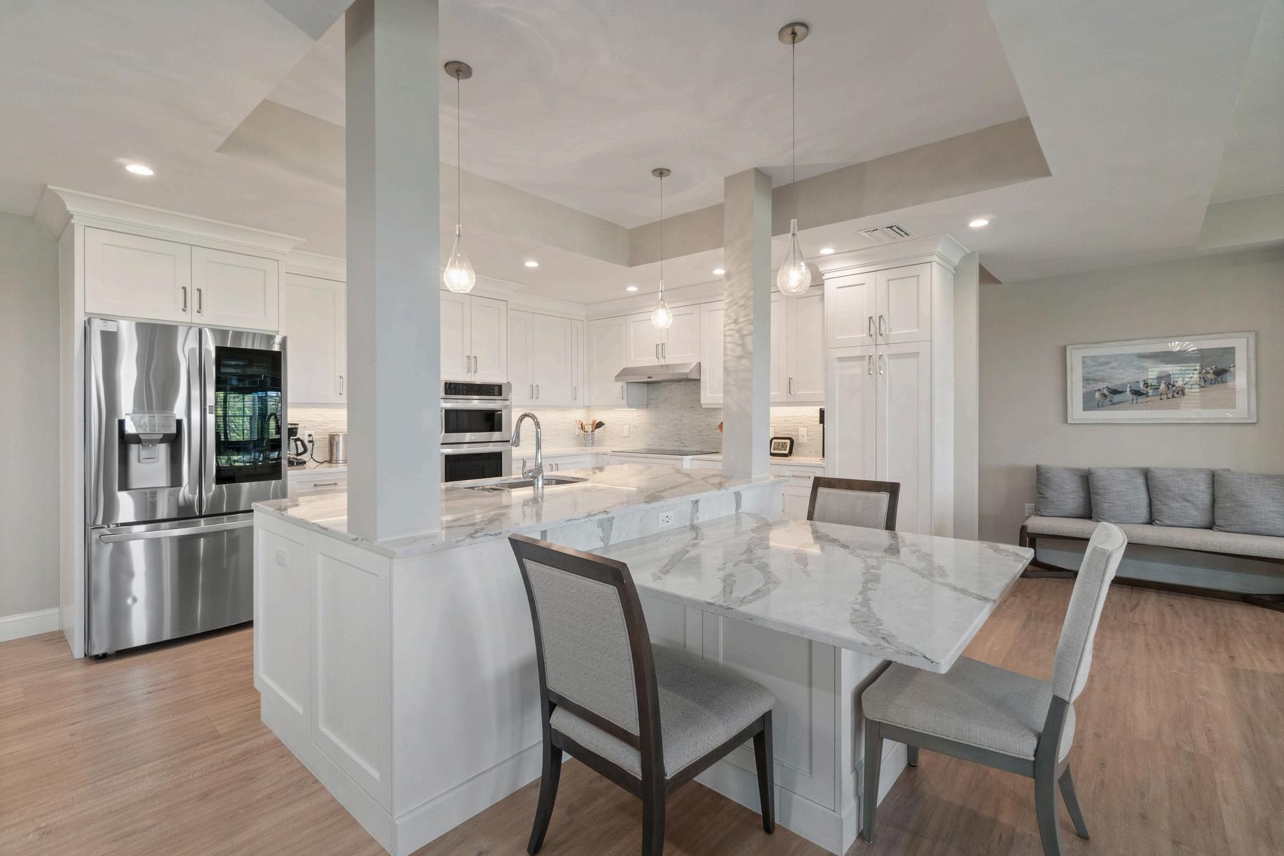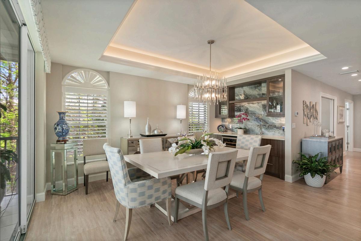 Step onto the expansive screened lanai and take in tranquil golf course and lake views an ideal setting for relaxing or entertaining The beautifully designed chef’s kitchen features quartz countertops, crisp white cabinetry, a T-shaped island with ample seating, and high-end appliances Adjacent to the kitchen, the formal dining area provides an elegant space for entertaining, complete with a wet bar and wine refrigerator.