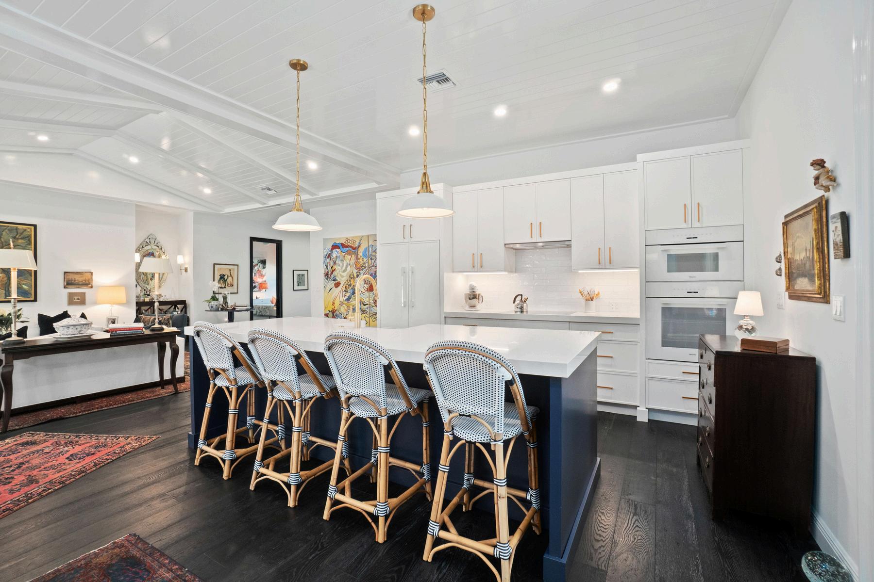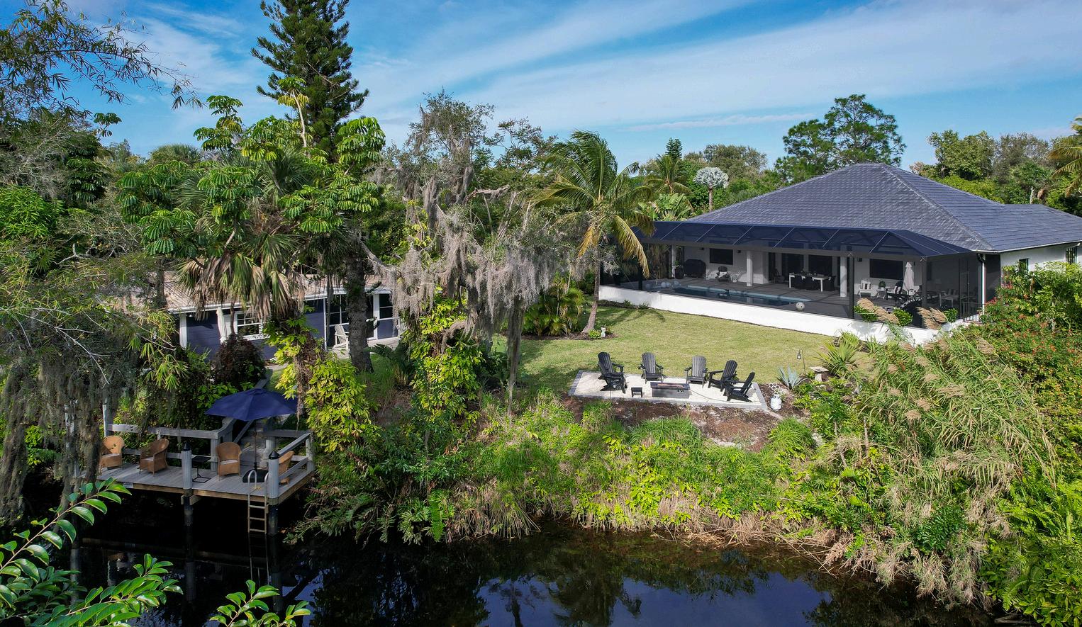 Enjoy southern exposure for stunning sunsets over the river and optimal sunshine on the pool Moss-draped trees create a picturesque backdrop, while the Hardie plank dock offers the perfect place to relax and watch manatees and dolphins glide by. This home offers 2,743 sq ft under air, 4 bedrooms + den, 3 full baths, 2 half baths, a 2-car garage, a private guest house, and hurricane-impact windows and doors throughout The contemporary design showcases soaring vaulted ceilings with tongue-and-groove and beam accents, wood and tile flooring, and a wall of 9-ft French doors that flood the home with natural light. The chef’s kitchen features white quartz countertops, crisp white cabinetry, high-end appliances, a cozy breakfast nook, and a spacious butler’s pantry/laundry room with abundant storage