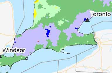 The wide swath of purple on the map shows the area in southwest Ontario that has received between 150 and 200 per cent of normal rainfall since mid-June. Tiny blue areas mapped in our region northeast of London delineate localized areas that have had more than 200 per cent or double the long-term average rainfall for the area.