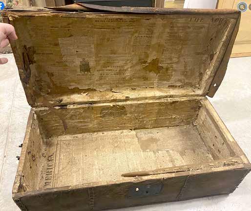 been glued and had strips of leather with nails/studs to reinforce the leather. Note the lock mechanism front and centre. Left and right side bottom interior, show nail heads/holes which attached handles, partially visible on the left side. These look to be wrought iron. The handles were probably added, prior to the newspaper.
