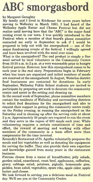 The Elmira Syrup Festival and the New Hamburg Quilt Auction were brought into that first festival to implement their local flavour, but the festival was started in earnest to promote Wellesley and its major businesses, A.W. Jantzi & Sons Ltd. and the J.M. Schneider Cheese Factory.