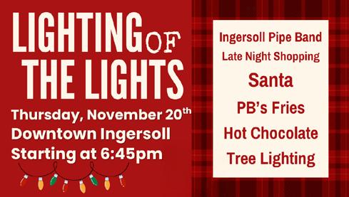 Thursday, November 20, Ingersoll Pipe Band 6:45 pm, Tree Lighting at 7 pm