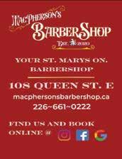 COLDWELL BANKER HOMEFIELD LEGACY REALTY, BROKERAGE Broker for Coldwell Banker Home eld Legacy Realty, Brokerage 150 Queen Street East, St. Marys, ON Cell: 519-272-7666 | O ce: 519-284-2381 *Each o ce is an independently owned & operated member broker of Coldwell Banker A liates of Canada Ron Morrison FREE Thursday, May 23, 2024 Issue #1212 Adult Program Ca orie Burn ng Weight oss Increased Energy Recreational & Competetive programs 4 to 6 years Little Ninjas Al Ages Stress Relief Mental Focus Flexibil y/Balance adult karate 7 to 9 years 10 to 12 years 13 to 17 years Junior Karate cardio kickboxing www stonetownkarate ca Start Today Free Trial Class Continued on page 2 Continued on page 3 Black's Financial Services Inc. TERM 1 year 3 years 5 years GIC 5.50 5.07 4.90 GIC INSURED *All rates subject to change without notice* Call us for details 519.284.1340 Are you taking advantage of the TFSA? 1 YR 5.02 - 3 YR 4.67 - 5 YR 4.36 For more products and Financial Advice call us today! Black's Financial Services Inc. Call us for details 519.284.1340 www.rivervalleygolfandtube.com Call us for inquiries at 519.225.2329 Friday 9 & Dine 9 holes, cart & dinner (lasagna)! $40 + tax/person Wing night is back Thursday June 6th! Golf lessons available for all skill levels with Andrew Ross! SAVE UP TO $12,200 OFF Save up to $12,200 off on New 2024 Ram 2500 HD trucks Yes with no charge Diesel and AllRoads Discounts you can save up to $12200 on our stock 2024 HD Diesel Ram Trucks AllRoads.ca | 519-284-3308 See AllRoads Dodge Chrysler Jeep Ram 36 Water St. S., St. Marys ON | 519.284.0041 | info@stmarysindependent.com | www.stmarysindy.com St. Marys Independent Order of the Eastern Star St. Marys chapter to close after 99 years St. Marys council awards nearly $1.8-million contract for Wellington Street South reconstruction Cooling their heels. This group of Amish women from Vestaburg, Mich. enjoyed frolicking below the Falls in St. Marys on Saturday. One to two years ago, several St. Marys area families relocated to two church communities in central Michigan. A total of 46 Amish made the bus trip to this area on the weekend. Photo by Pat Payton LINCS AWARDS BANQUET PAGE 16 FAVOURITE CHEF PAGE 11