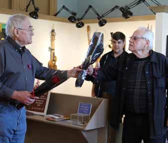 Gallery curator Cameron Porteous presents a St. Marys rose to Matthew Mackey, son of the late James L. Mackey, whose portraits are featured in the new exhibit.