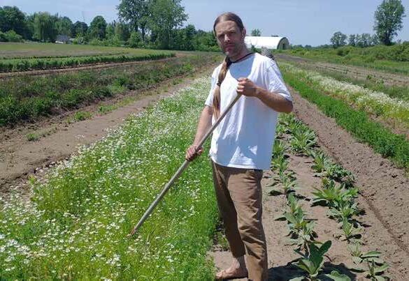 Youth volunteer-herb aficionado Patrick Sijs hoes the chamomile, mullein grows behind him Kim North in her “teaching garden” beside her farm store