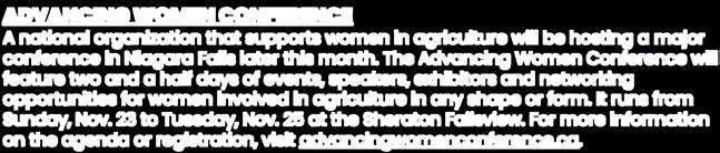 A national organization that supports women in agriculture will be hosting a major conference in Niagara Falls later this month. The Advancing Women Conference will feature two and a half days of events, speakers, exhibitors and networking opportunities for women involved in agriculture in any shape or form. It runs from Sunday, Nov. 23 to Tuesday, Nov. 25 at the Sheraton Fallsview. For more information on the agenda or registration, visit advancingwomenconference.ca