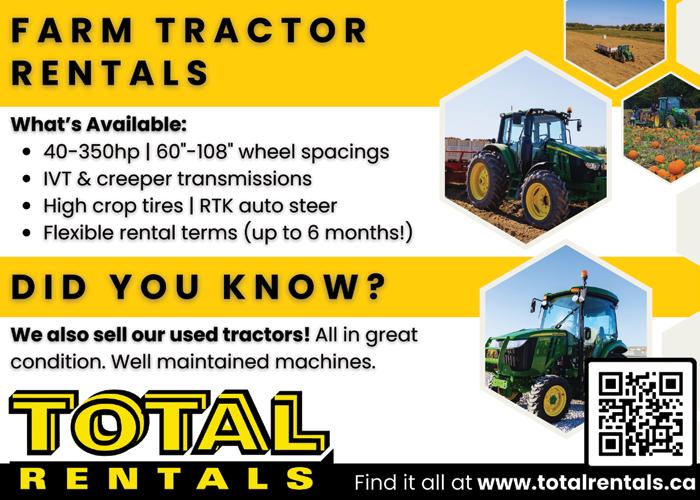 Stewart Grant 905-229-2805 | www.griffinbte.ca 219 Park Ave E, Dunnville, N1A 0A8 • james@griffinbte.ca TRACTOR RENTALS. AVAILABLE DAILY, WEEKLY, MONTHLY. CALL TODAY FOR ALL YOUR EQUIPMENT RENTAL NEEDS. SERVING THE NIAGARA REGION AND BEYOND 2009 Massey Ferguson 7485 Tractor, 8000 Eng hrs, 130HP, 7485 Dyna vt. Four sets of remotes. $65,000 1222649 2024 Nardi Harvesting ORBIS 4m Highspeed Disc, rigid frame ,3pt or trailed version avail $Call 1270342 2024 Nardi Harvesting BRAND NEW CAMBRIDGE Sprocket Packer, 24’ narrow transport width $33,000 1270341 2009 McCormick TTX230 Tractor, 4000 Eng hrs, 213HP, With loader, 32 speed transmission, 3 sets of remotes $79,999 1228930 2000 John Deere 920F Header - Flex, good condition header, lots of new knives and guards, $7,500 1264038 1992 John Deere 750 Drill, Good condition lots of new parts, market auger $Call 1264040 20 Red Max RZT54X Mower - Zero Turn, 54” $7,200 1222688 2005 International 4300 Truck - Flatbed, With landscape dump. DT466 Automatic juice. $18,000 1227650 2022 WiL-BE G8-2300 Grader,Smart surface tools driveway grader. $19,750 1222690