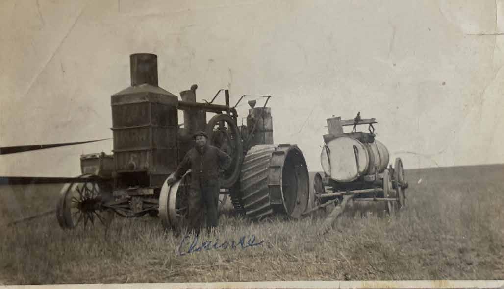 is it’s powering a thrashing machine. I don’t know if the photo was taken on my grandfather’s home farm in Norfolk County or on the farm he homesteaded in Saskatchewan, but suspect it was the latter from the terrain. My research found this was likely an early steam tractor.