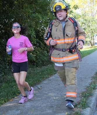 Norfolk firefighters Doug Rixmann, Noah Richtie and Katie Petrella from the Simcoe Firefighters Association ran 5-km Sunday – in full firefighter gear - carrying 45-50 pounds of gear, including 30-pound air tanks.
