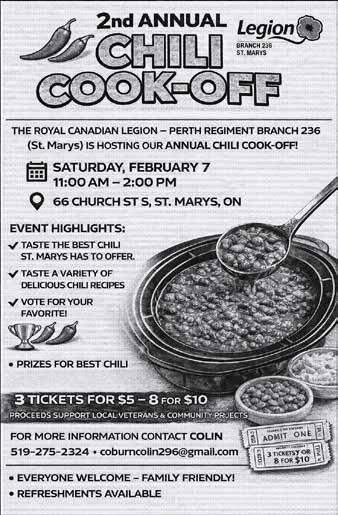 - Royal Canadian Legion chili cook-off – 11 a.m. to 2 p.m.