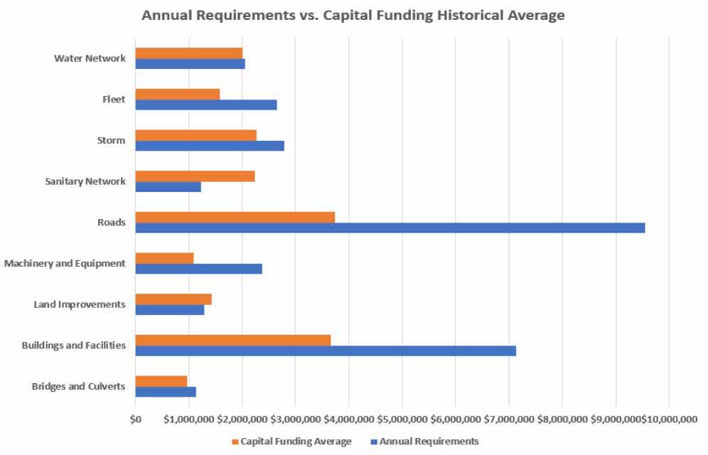 Roads are the hardest hit of the city’s asset categories. They require an average annual requirement of $9.5 million and received a historical average of $3.7 million. That is a $5.8 million deficit each year.