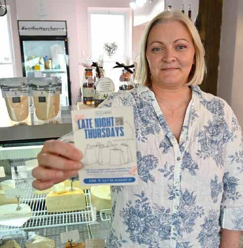 Late Night Thursdays return in downtown Tillsonburg on July 24. The Downtown Tillsonburg BIA promotion involves several stores and restaurants in the downtown area staying open until 8 p.m. on Thursday nights, and offering samples of their products and special deals. Visitors are allowed to draw coupons that will give them a discount at downtown restaurants. Kelly Purtill, co-owner of Two Girls and A Cheese Shop, is one of the participants and is picturing during the inaugural Late Night Thursday.