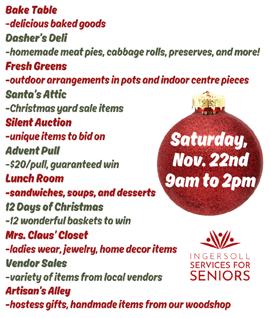 Visit our amazing downtown businesses during these crazy days of Christmas promotions and deals. For individual business promotions and deals check our new website for the Downtown business directory. Enjoy a stroll downtown and view the local businesses with windows dressed in true Canadian splendour, then vote for your favourites on our new website https:// www.downtowningersoll.ca/. Shop Canada, Shop Local, Shop Ingersoll!