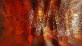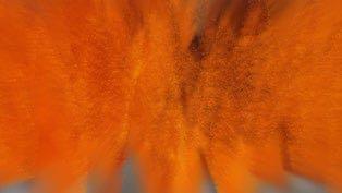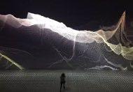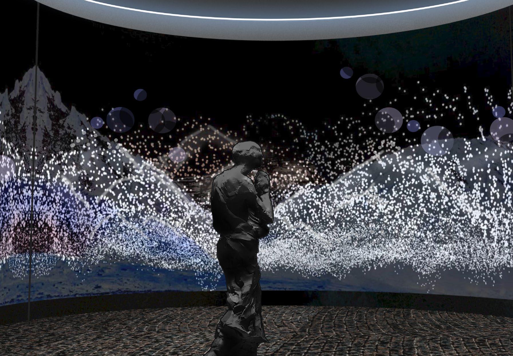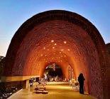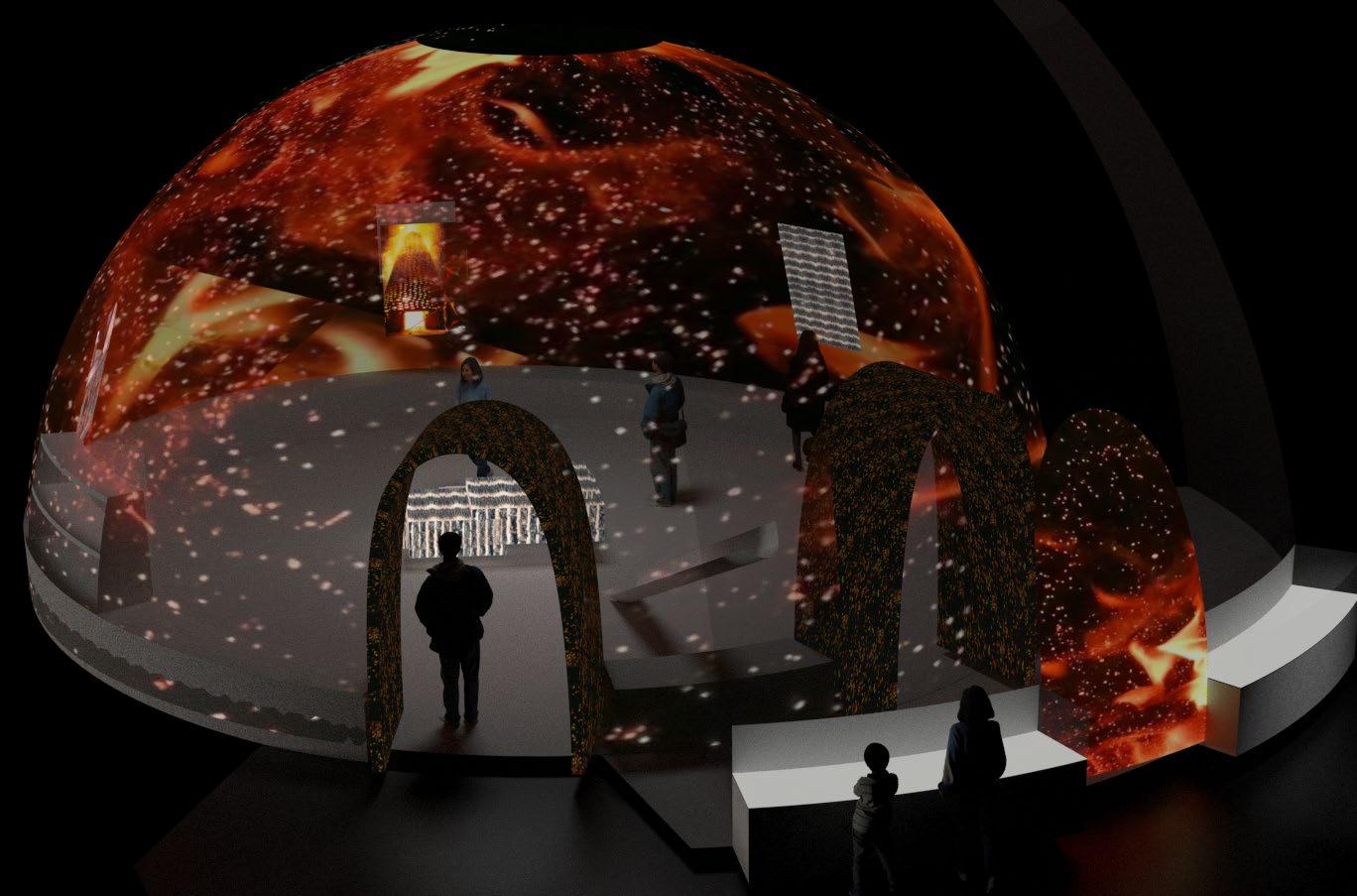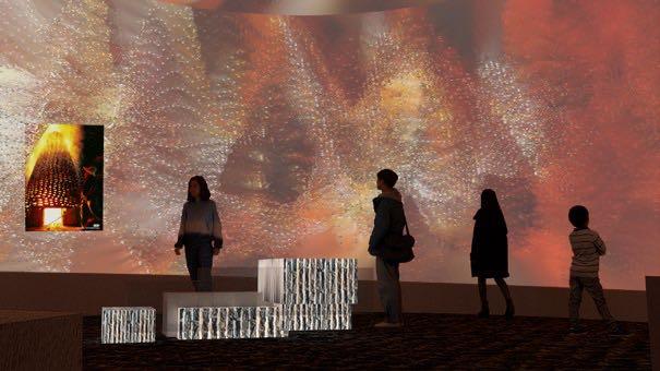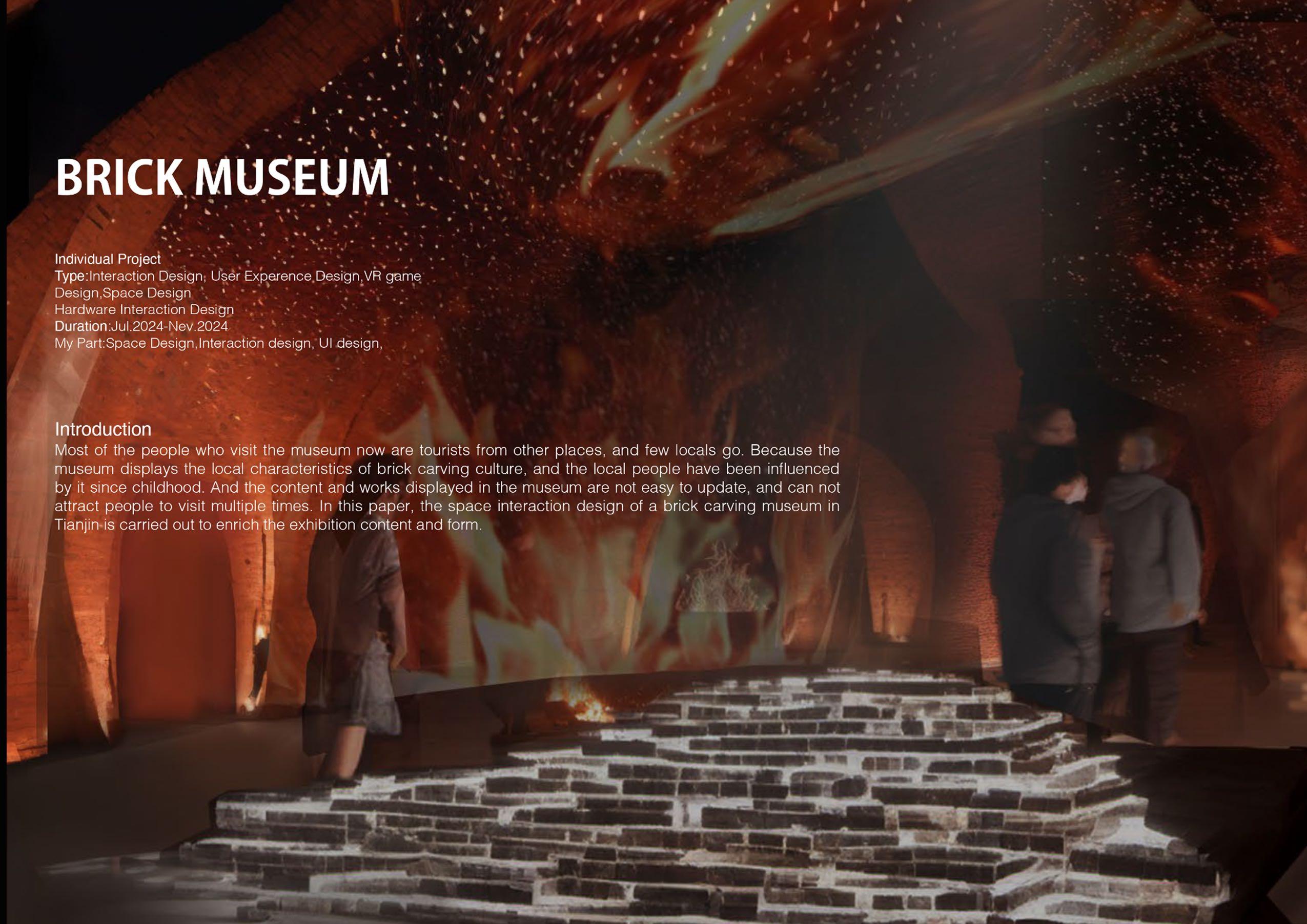 The outer wall of the semi-circular space imitating the brick kiln projects the texture of the outer wall of the brick kiln in sequence, the blue smoke projected by the sky when the bricks are placed, the fire during firing and the finished brick carving.