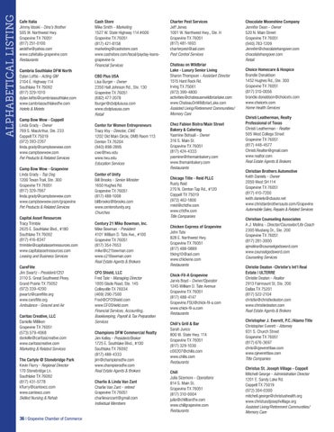 Cafe Italia Jimmy Idoski - Dino’s Brother 505 W. Northwest Hwy. Grapevine TX 76051 (817) 251-0100 aeddfw@yahoo.com www.cafeitalia-grapevine.com Restaurants Cambria Southlake DFW North Dylan Loftis - Acting GM 2104 E. Highway 114 Southlake TX 76092 (817) 329-1010 dylan.loftis@cambriasouthlake.com www.cambriasouthlakedfw.com Hotels & Motels Camp Bow Wow - Coppell Linda Grady - Owner 769 S. MacArthur, Ste. 233 Coppell TX 75019 (972) 393-2267 linda.grady@campbowwow.com www.campbowwow.com Pet Products & Related Services Camp Bow Wow - Grapevine Linda Grady - Top Dog 1200 Texan Trail, Ste. 300 Grapevine TX 76051 (817) 329-7667 linda.grady@campbowwow.com www.campbowwow.com/grapevine Pet Products & Related Services Capital Asset Resources Tracy Trimble 2625 E. Southlake Blvd., #180 Southlake TX 76092 (817) 416-8347 ttrimble@capitalassetresources.com www.capitalassetresources.com Leasing and Business Services CareFlite Jim Swartz - President/CEO 3110 S. Great Southwest Pkwy. Grand Prairie TX 75052 (972) 339-4200 jswartz@careflite.org www.careflite.org Ambulance - Ground and Air Caritas Creative, LLC Danielle Milliken Grapevine TX 76051 (573) 579-4068 danielle@caritascreative.com www.caritascreative.com Marketing & Related Services The Carlyle @ Stonebridge Park Kevin Flurry - Regional Director 170 Stonebridge Ln. Southlake TX 76092 (817) 431-5778 kflurry@cantexcc.com www.cantexcc.com Skilled Nursing & Rehab