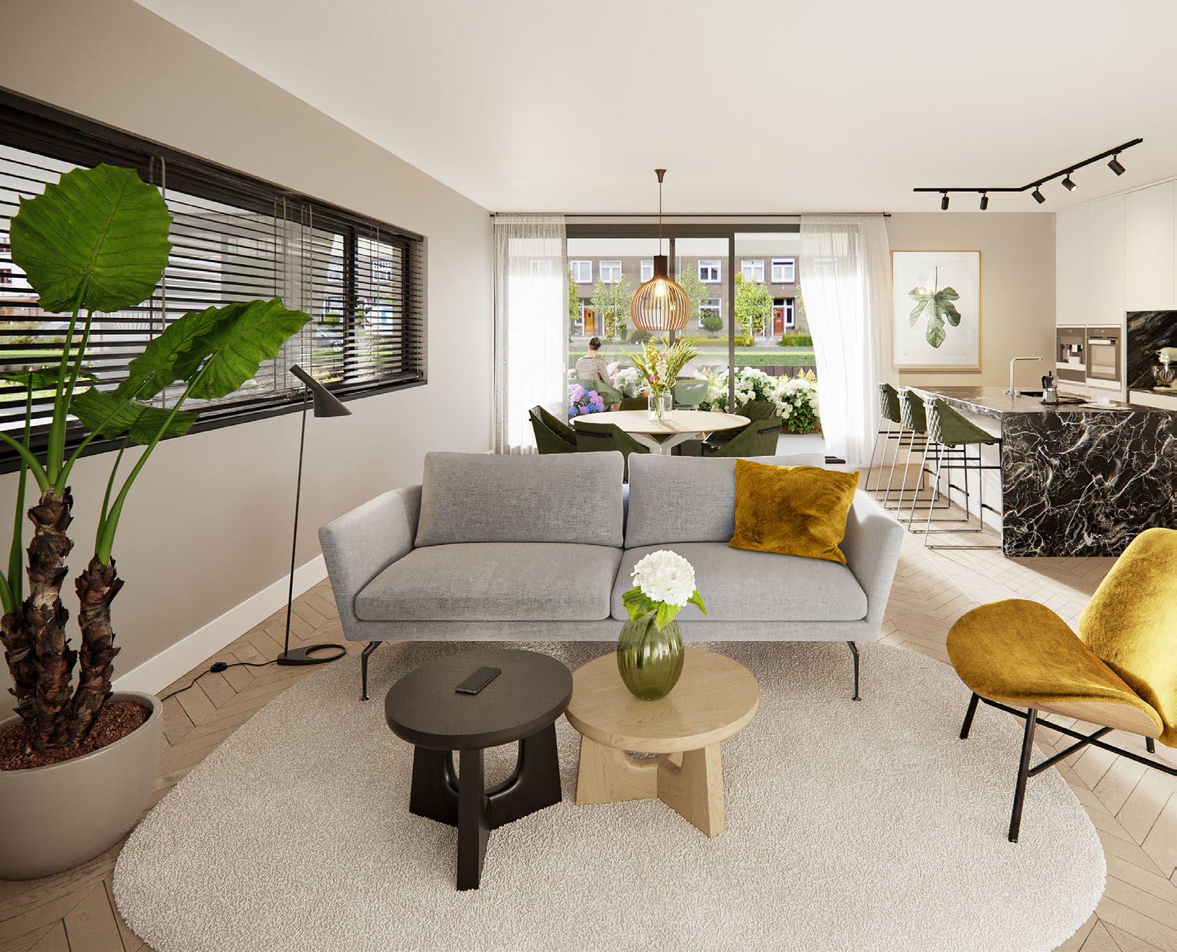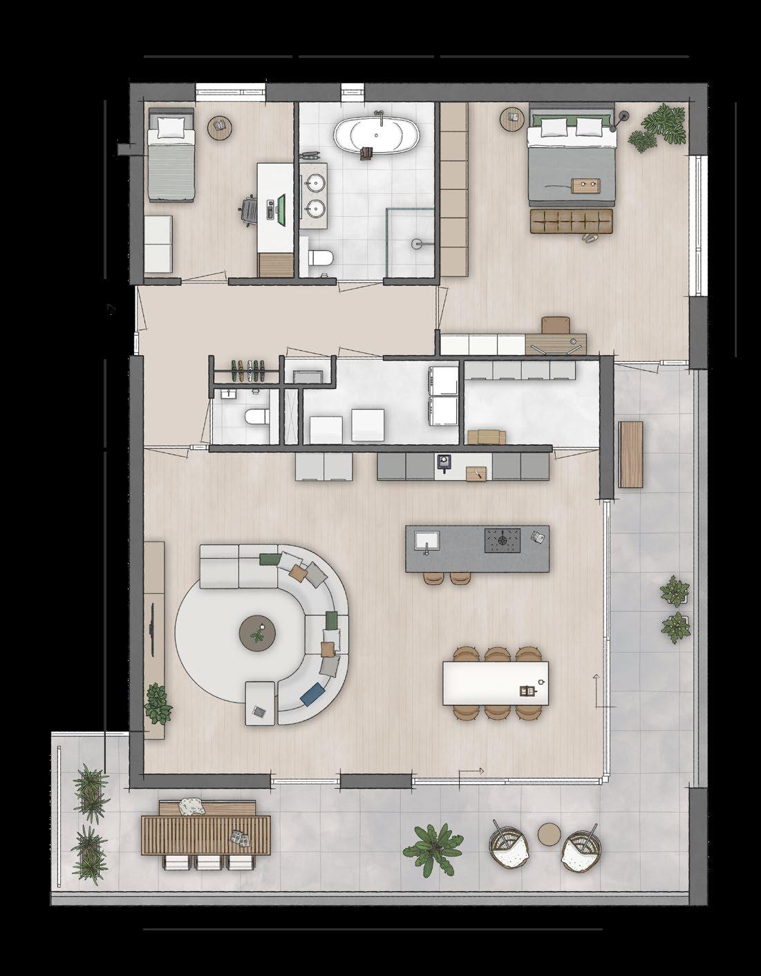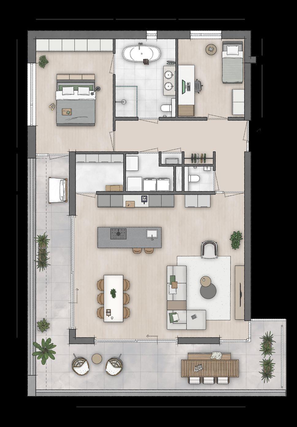 Deze brochure is bedoeld om een indruk te geven van de aangeboden appartementen. Er kunnen uitdrukkelijk geen rechten aan worden ontleend. De opgenomen plattegronden en gevelaanzichten zijn impressies. De inrichtingen zijn een vrije interpretatie van de architect en wijken af van het standaard afwerkingsniveau. Binneninrichting, keukens, vloerbedekking, stoffering, meubilair, planten e.d. zijn niet in de verkoopprijs inbegrepen.