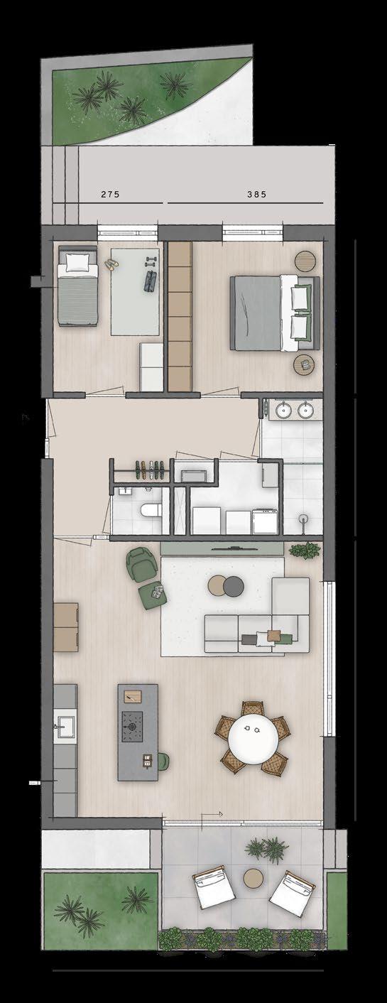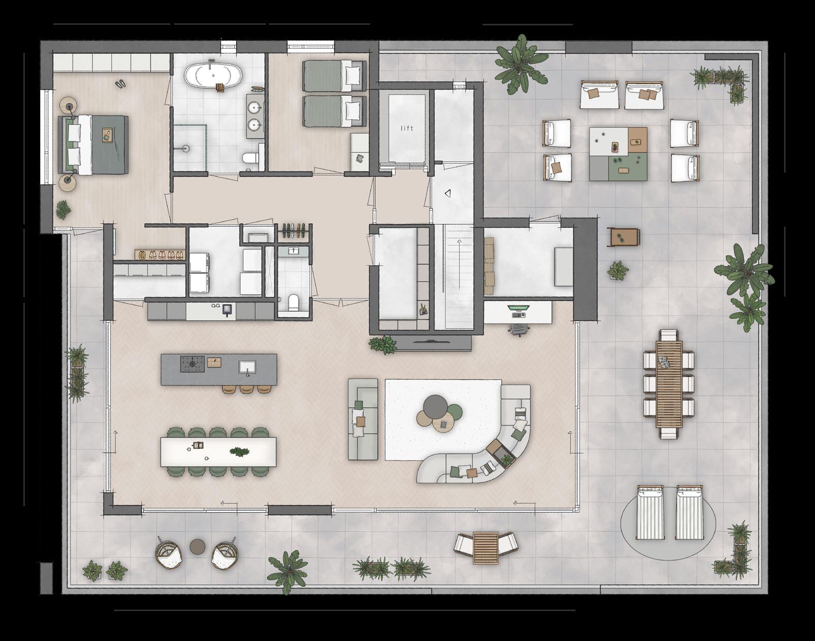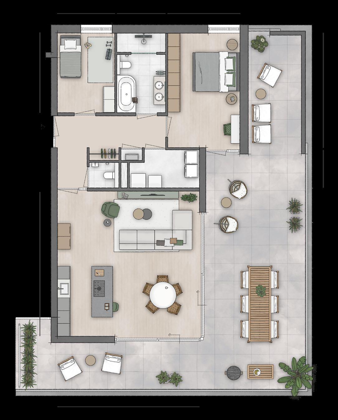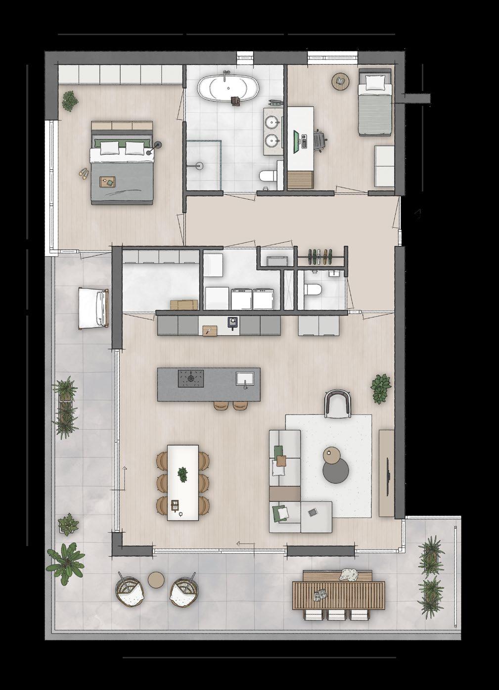 Deze brochure is bedoeld om een indruk te geven van de aangeboden appartementen. Er kunnen uitdrukkelijk geen rechten aan worden ontleend. De opgenomen plattegronden en gevelaanzichten zijn impressies. De inrichtingen zijn een vrije interpretatie van de architect en wijken af van het standaard afwerkingsniveau. Binneninrichting, keukens, vloerbedekking, stoffering, meubilair, planten e.d. zijn niet in de verkoopprijs inbegrepen.