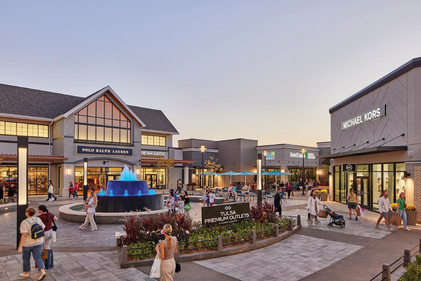 A new build, Tulsa Premium Outlets in Jenks is thriving. With more than 75 retailers and casual eateries, plus a 20,000 square-foot children’s play area, green spaces for gathering, a fire pit and a fountain, people come from near and far for more than shopping.