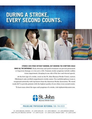 STROKES CAN STRIKE WITHOUT WARNING, BUT KNOWING THE SYMPTOMS COULD MAKE ALL THE DIFFERENCE. Early detection and quick treatment can prevent permanent or long-term damage, or even save a life. Common stroke symptoms include sudden vision impairment, drooping in one side of the face and slurred speech. At the first sign of a stroke, count on the St. John Heyman Stroke Center, eastern Oklahoma’s only certified comprehensive stroke center. Our multidisciplinary team is recognized nationally with top honors from the American Stroke Association. We stand ready 24/7 to provide patients with the highest quality of care when every second counts. To learn more about the signs and symptoms of a stroke, visit stjohnstrokecenter.com.
