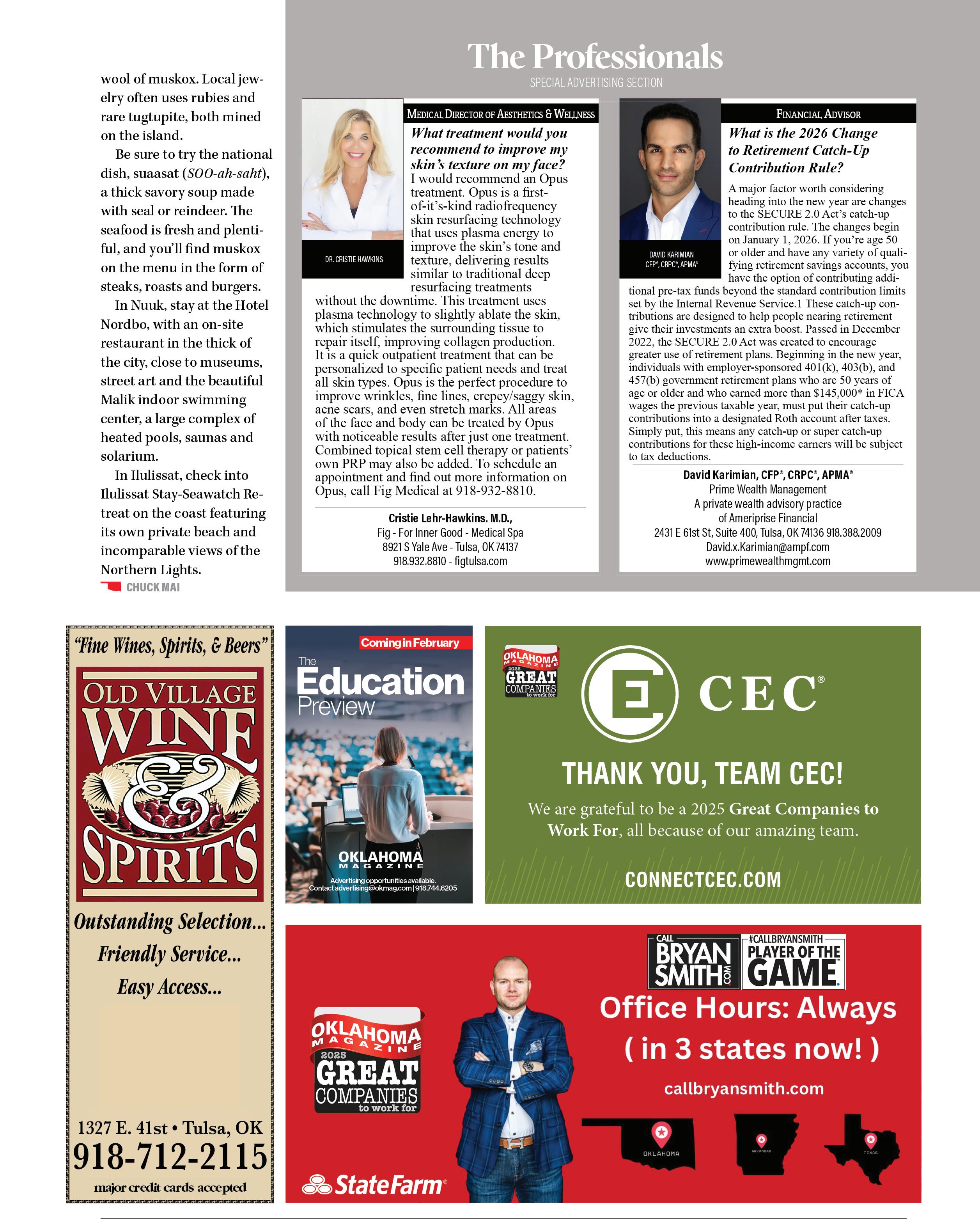 One of our biggest features of the year also drops this month: Great Companies to Work For (page 28). Shining a light on 160+ companies in Oklahoma, this piece explores the businesses that are redefining success, making their employees proud, and raising the bar for workplace expectations nationwide. Be sure to check out our four accompanying CEO profiles, where we dig into leadership styles, workplace culture and what these innovators see on the horizon for 2026.