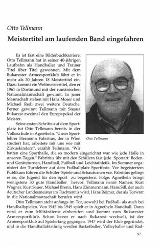 Es ist fast eine Bilderbuchkarriere: Otto Tellmann hat in seiner 40-jährigen Laufbahn als Handballer und Trainer Titel über Titel gewonnen. Mit dem Bukarester Armeesportklub fährt er in mehr als 30 Jahren 18 Meistertitel ein. Dazu kommt ein Weltmeistertitel, den er 1961 in Dortmund mit der rumänischen Nationalmannschaft gewinnt. In jener Mannschaft stehen mit Hans Moser und Michael Redl zwei weitere Deutsche. Ferner gewinnt Tellmann mit Steaua Bukarest zweimal den Buropapokal der Meister. Seine ersten Schritte auf dem Sportplatz tut Otto Tellmann bereits in der Volksschule in Agnetheln. "Unser Sportlehrer Hermann Fabritius, der in Wien Otto Tellmann studiert hat, arbeitete mit uns wie mit Zirkuskindern", erzählt Tellmann. "Wir hatten eine Sporthalle, die so modern eingerichtet war wie jede Halle in unseren Tagen." Fabritius übt mit den Schülern fast jede Sportart: Bodenund Geräteturnen, Handball, Fußball und Leichtathletik. Im Sommer organisiert der Turnlehrer auf dem Fußballplatz Sportfeste. Vor begeistertem Publikum führen die Schüler Spiele und Schauturnen vor. Fabritius gelingt es so, die Jugend für den Sport zu begeistern. Folge: Agnetheln bringt wenigstens 30 gute Handballer hervor. Tellmann nennt Namen: Kurt Wagner, Kurt Sauer, Michael Brenn, Hans Zimmermann, Hans Sill, der auch deutscher Landesmeister im Tischtennis wird, Hans Reimer, der als Torwart in die Nationalmannschaft berufen wird. Otto Tellmann steht anfangs im Tor, sowohl bei Fußball- als auch bei Handballspielen. Von 1945 bis 1949 spielt er in Agnetheln Handball. Dann wird er zum Militärdienst einberufen und kommt zum Bukarester Armeesportklub. Schon bevor er nach Bukarest wechselt, ist der Armeesportklub auf Spielerfang gegangen. 1947 wird der Klub gegründet, und in die Handballabteilung werden Basketballer, Volleyhaller und Rad97