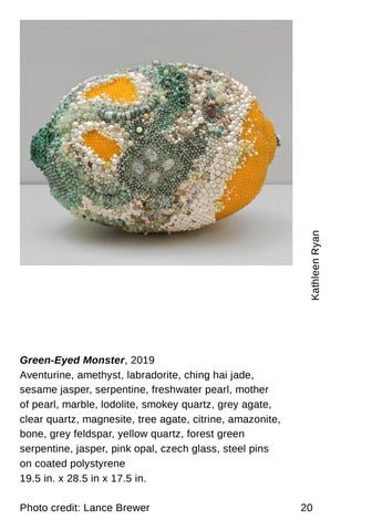 Kathleen Ryan Green-Eyed Monster, 2019 Aventurine, amethyst, labradorite, ching hai jade, sesame jasper, serpentine, freshwater pearl, mother of pearl, marble, lodolite, smokey quartz, grey agate, clear quartz, magnesite, tree agate, citrine, amazonite, bone, grey feldspar, yellow quartz, forest green serpentine, jasper, pink opal, czech glass, steel pins on coated polystyrene 19.5 in. x 28.5 in x 17.5 in. Photo credit: Lance Brewer
