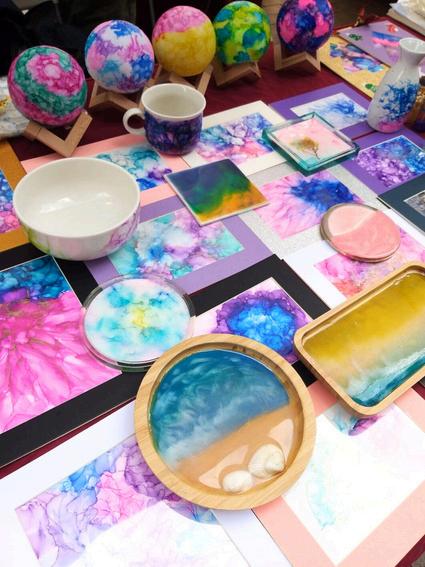 品、盆栽、扭氣球、酒精流體畫、 彩繪、特⾊郵票等等