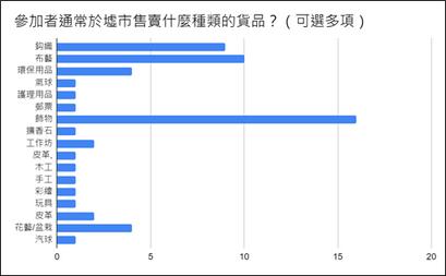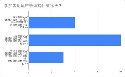 ⽽根據問卷調查結果,參加者亦大致滿意參與「墟市預備工作坊」及墟市擺檔實 習的安排;此外,就墟市活動選墟的意⾒,當中有部份參加者期望墟市選址能夠 鄰近⾃⼰的居所、可於就近的社區擺檔,以及於基層的社區擺檔,貨品較貼近⺠ ⽣及⽇常⽣活需要。