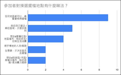 有部份參加者期望墟市選址能夠鄰近 ⾃⼰的居所、可於就近的社區擺檔; 亦有部份參加者希望於基層社區擺