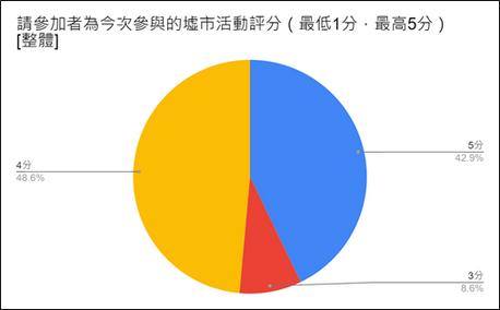 此外,參加者亦大致滿意墟市擺檔實習的安排,包括﹕墟市活動的場地選 址、⽇期、營業時間、⼈流、活動收費的安排,當中超過4成(42.9%)參加 者給予5分最⾼分評價,亦有超過4成半(48.6%)參加者給予4分⾼分評價。
