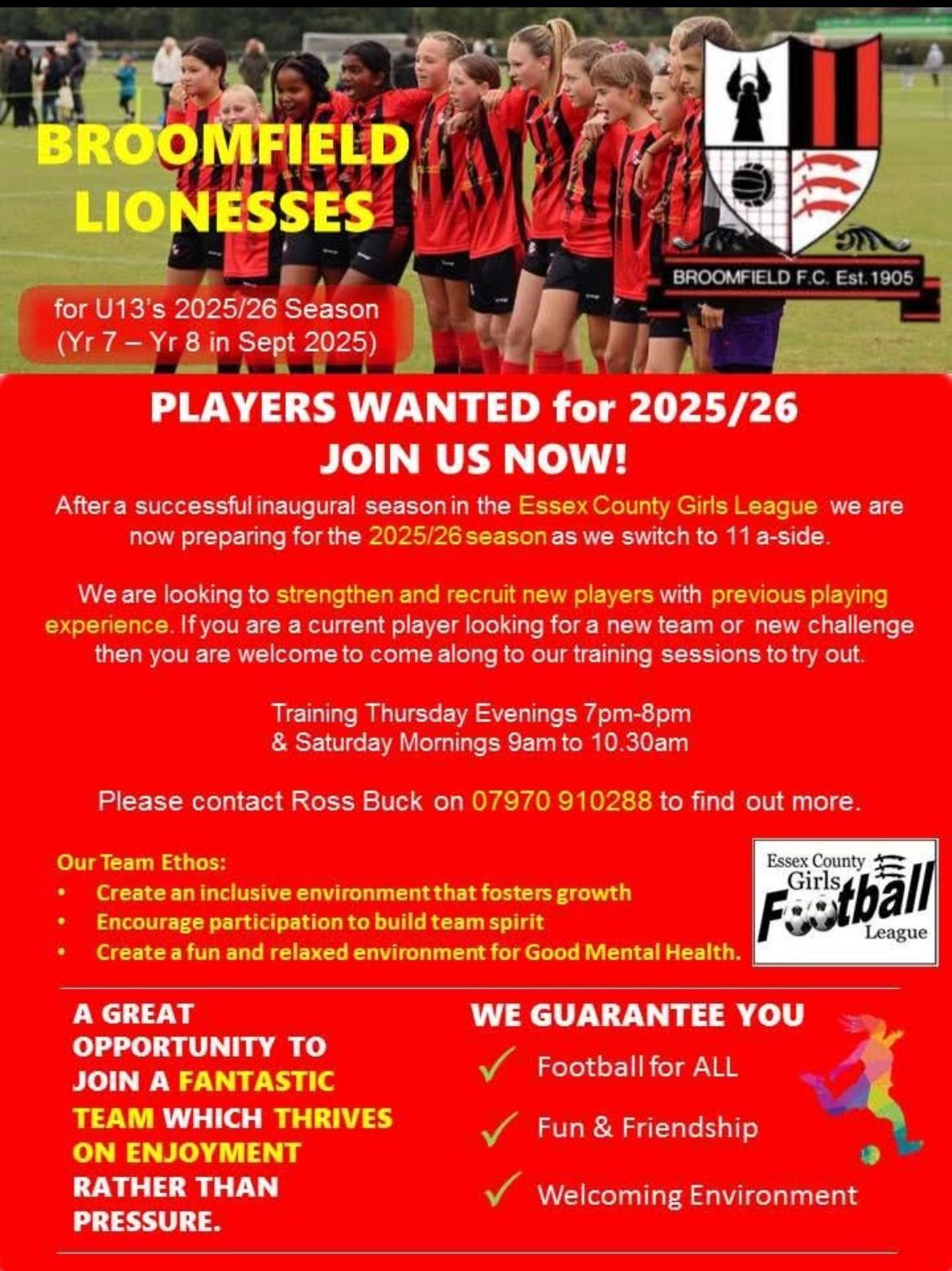 Grassroots Magazine is committed to giving back to grassroots football and we are excited to sponsor a talented young player Kaci Crook & an equally talented youth team in Broomfield Lions U13’s for this season.