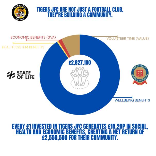 Tigers FC have learned the social value to their local community equates to £2,827,100 per year,having become one of the first grassroots clubs to have engaged with the Essex County FA’s brand-new, cutting edge‘SocialValue Estimator’facility.