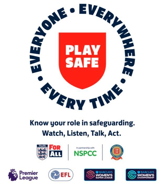 Not only is Play Safe endorsed by the NSPCC, it is also supported across every level of English football, including: Premier League, English Football League, Barclays Women’s Super League, Barclays Women’s Championship, National League. Additionally, Play Safe aligns closely with the Essex County FA’s #PlayYourPart Matchday Environment resources.