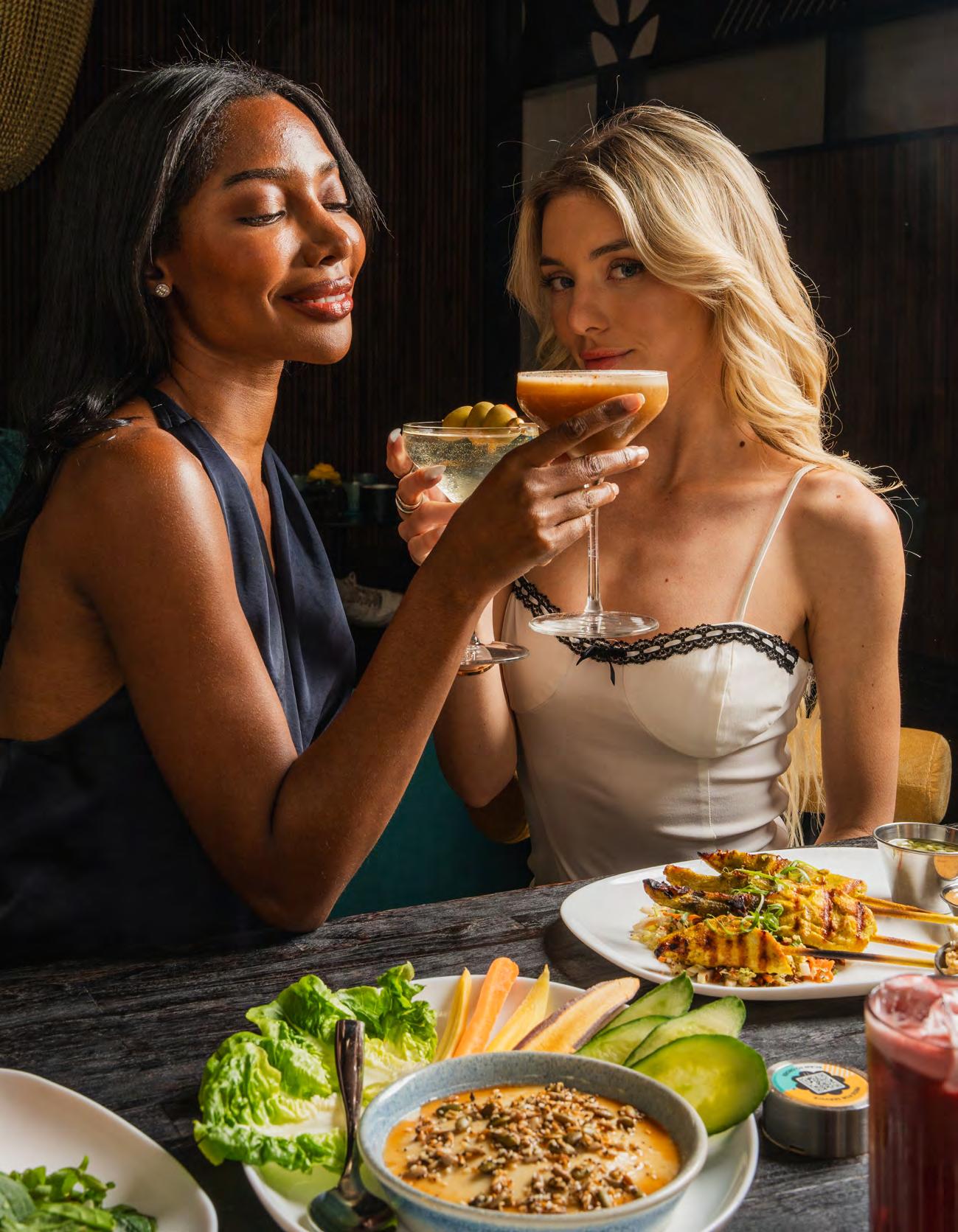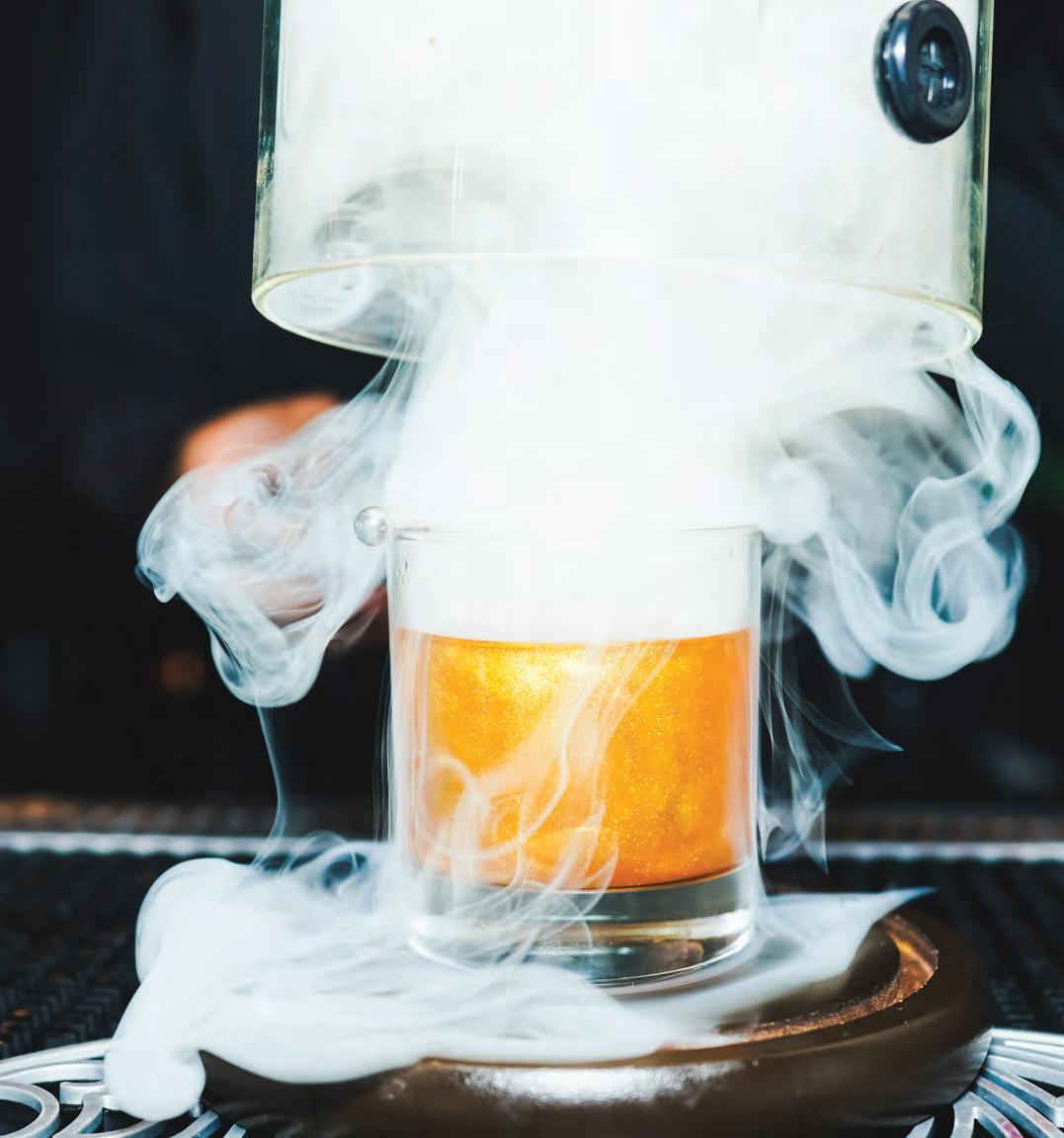 lighting, intimate proportions, and a bar program that treats cocktails less as commodities and more as ritual. True to its name, the menu leans into elixirs, tonics, and layered avors that feel restorative as much as indulgent. The Buzzing Moon balances Barr Hill Gin with passion fruit, coconut, and lemon for something tropical yet restrained. The Fizz, made with Grey Whale Gin, pumpkin chai, aquafaba, and citrus, feels velvety and seasonal, a cocktail that rewards patience.