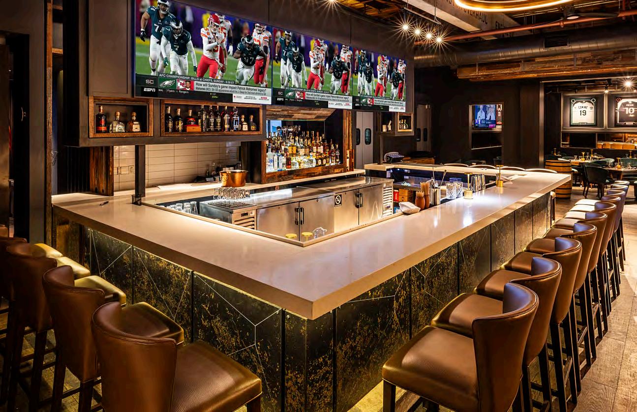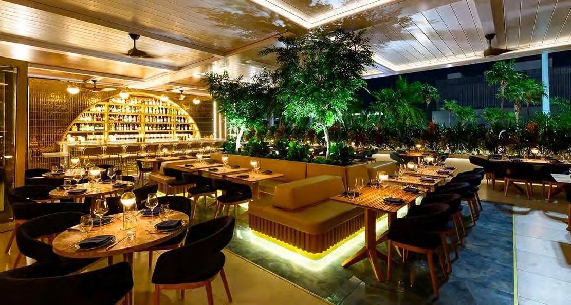 The preserved gray-stone exterior gives way to a warm, cinematic interior layered in wood and leather, where lighting deepens as the evening unfolds. The soaring ceiling of the former nave remains intact, lending the room grandeur without sacri cing intimacy. Former stained-glass windows have been reimagined as multicolored glass installations engineered to withstand hurricane season, maintaining drama while modernizing the space.
