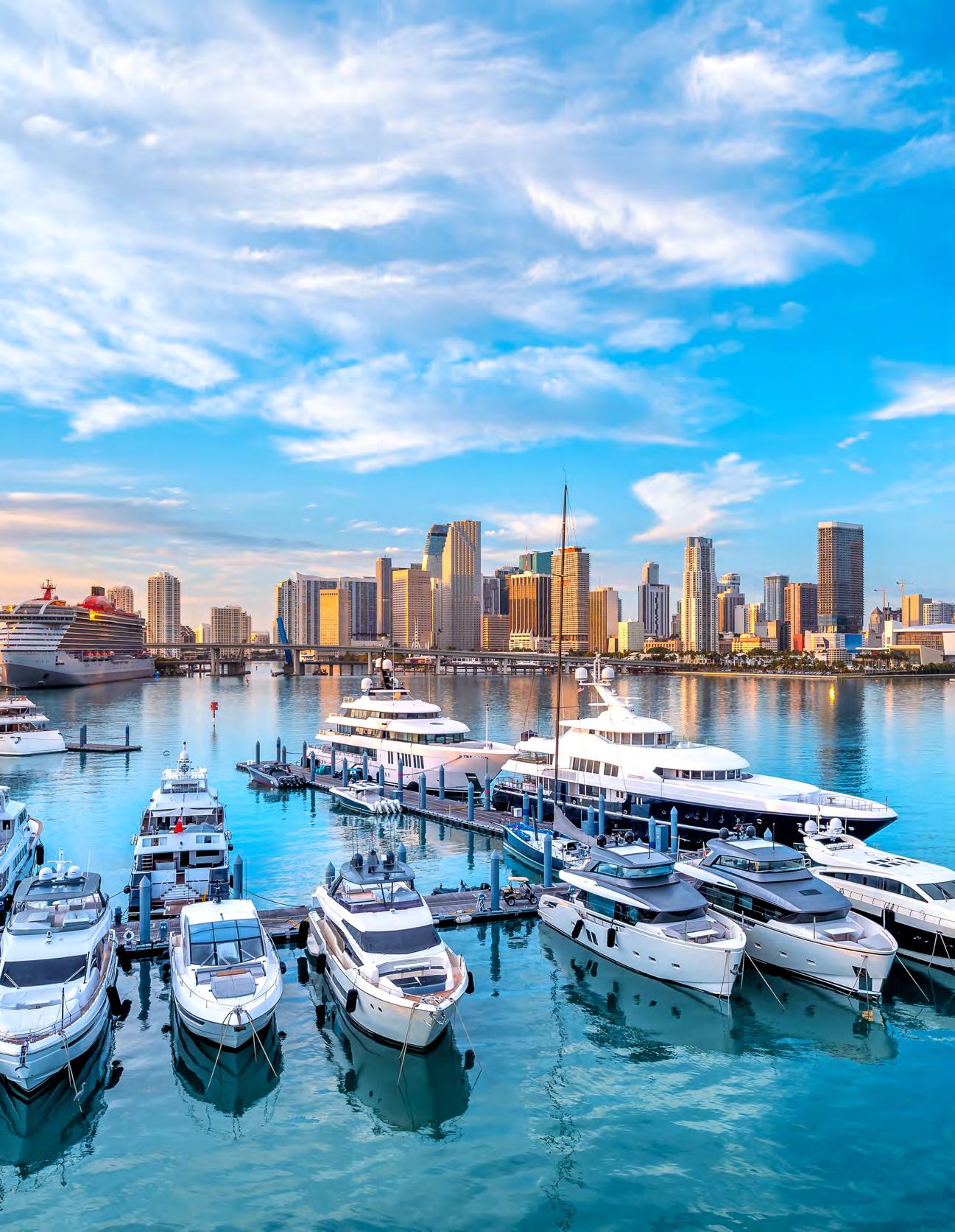 STANDOUT AMENITIES: Residents will enjoy an expansive 20,000-square-foot oceanfront pool deck featuring private cabanas, a dining lounge, outdoor bar, summer kitchen and tranquil sun deck. The project is also one of the few newconstruction projects o ering exclusive access to a private marina with nearly two dozen boat slips. Other upscale touches include the brand’s signature Peacock Alley-inspired lounge, a central gathering space reminiscent of those found in many Waldorf Astoria properties worldwide. Wellness takes center stage with a dedicated spa o ering a private treatment room, His/Her sauna and steam room, and mani/pedi services, along with a state-of-the-art tness and movement studio.