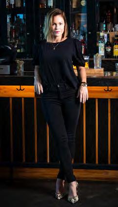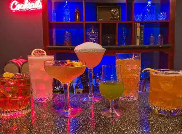 Then comes the turn. Guests pass through a red door into a Gatsbyinspired lounge where black walls, tin ceilings, and Art Deco motifs create a moody, theatrical backdrop. Live entertainment leans old-world and seductive, from Roaring Twenties-style torch singers to a Thursday burlesque show that favors elegance over excess.