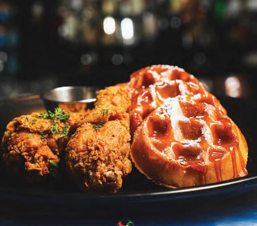 RIGHT: Kitchen + Kocktails by Kevin Kelley puts a new spin on chicken & wa es on page