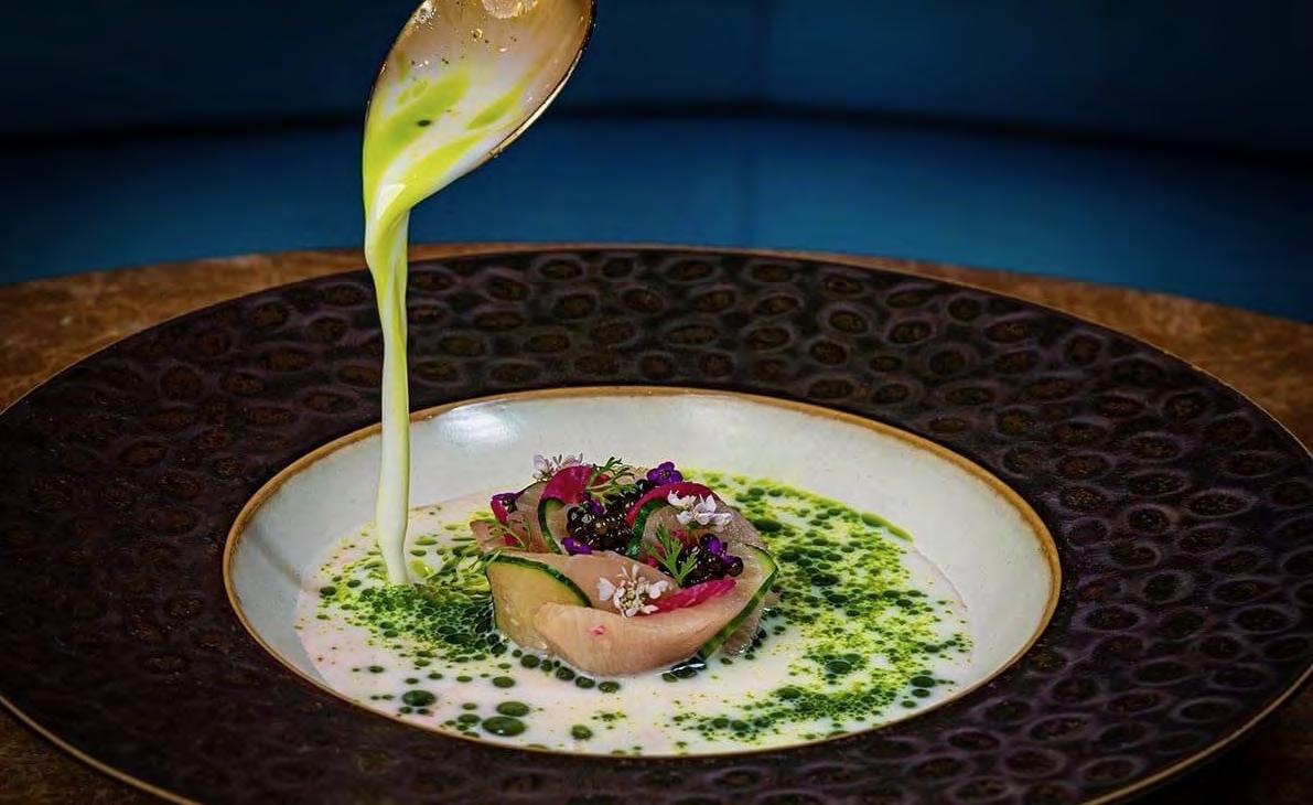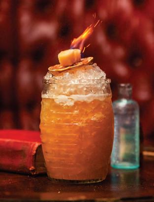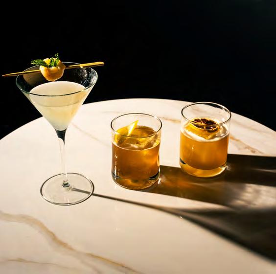 For guests craving a touch of drama, the Tiki Drink arrives with a ame garnish that adds spectacle without novelty. Classics are executed with equal respect, from a polished espresso martini to a bramble that tastes exactly as it should. The tableside Old Fashioned cart is the nal ourish, allowing guests to customize their pour with ne spirits, garnishes, and smoking options.