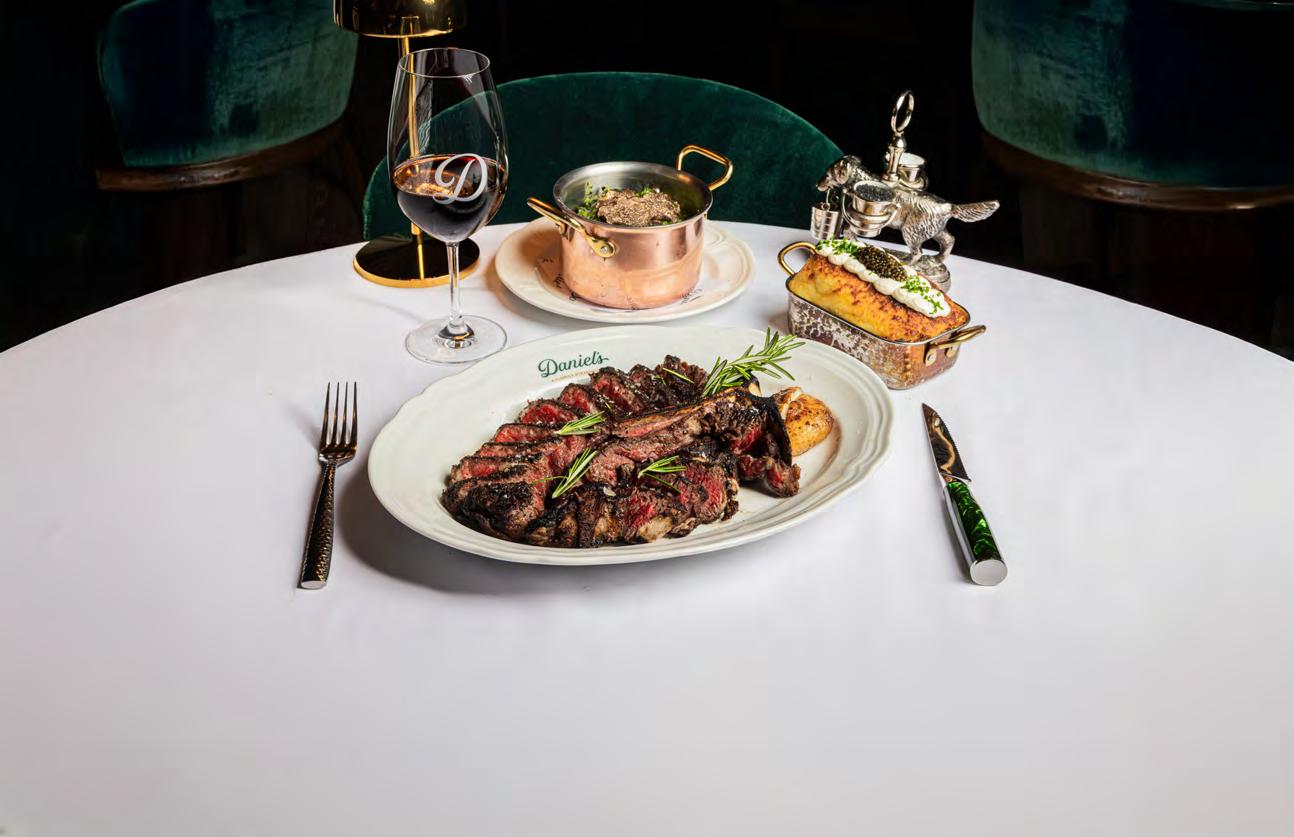 The menu reads like a modern steakhouse greatesthits list, anchored by serious cuts of beef, including A5 Miyazaki Wagyu Picanha ($275). A prime rib trolley glides tableside. Lobster spaghetti arrives glossy and decadent. Robuchon-style potatoes land impossibly smooth, whipped with butter and cream until they verge on silken. Seafood towers and composed starters add structure, while a wine list that stretches comfortably into four gures signals the room’s ambition.