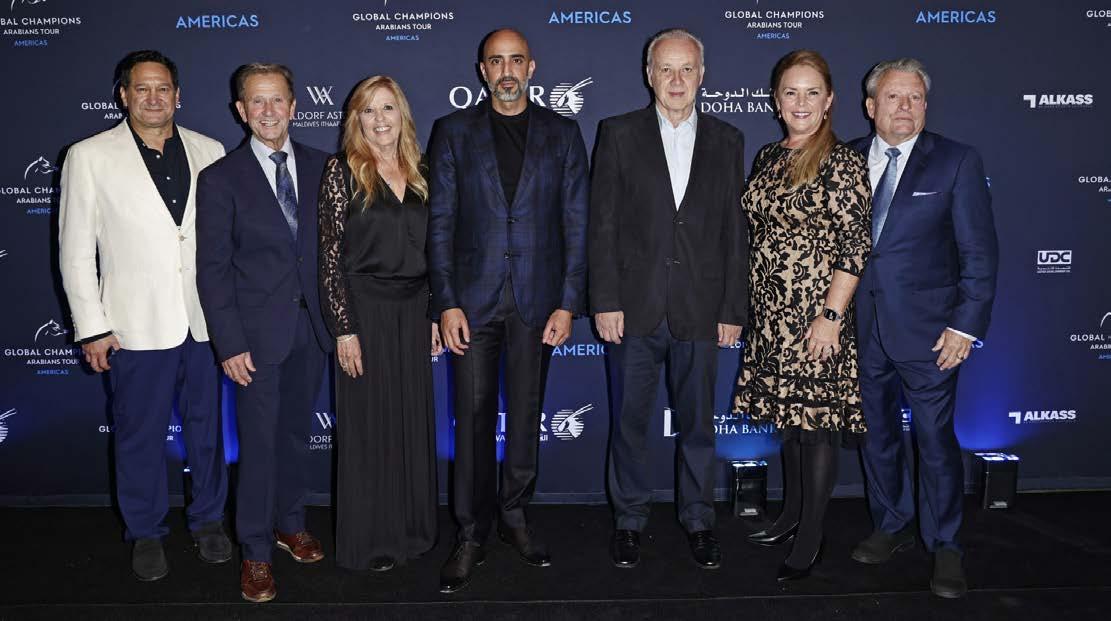 Jeff Sloan, Murray Popplewell, Cindy McGowen, Faleh Al Nasr, Francisco Carrasco, Taryl O’Sheal, and Greg Knowles attend the Global Champions Arabians Tour celebration for the 2025 GCAT season launch at the New World Center in Miami Beach, Florida. (Photo by John Parra/Getty Images).