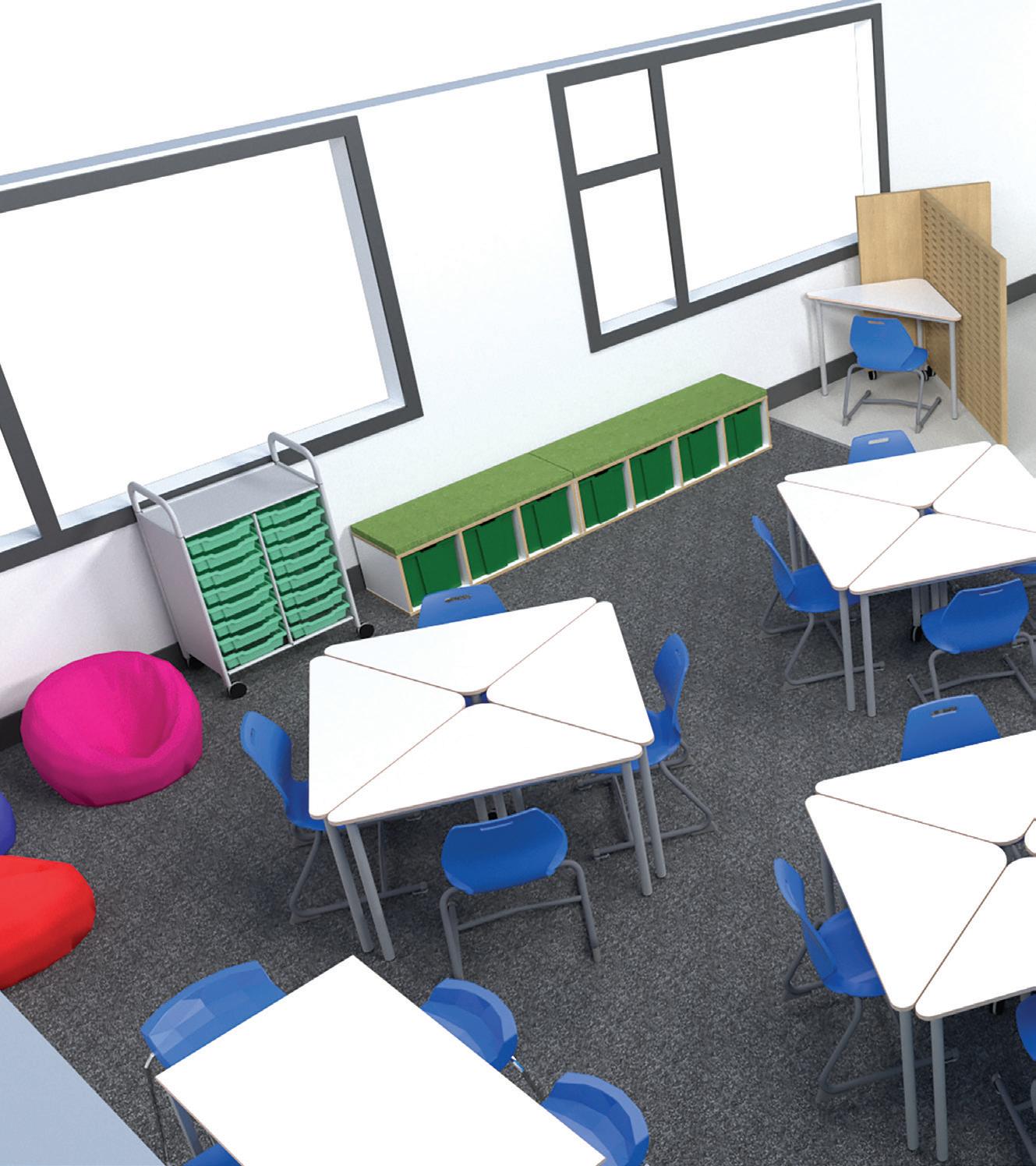 A range of configurations can be made to promote collaborative or independent learning in a standard UK size classroom.