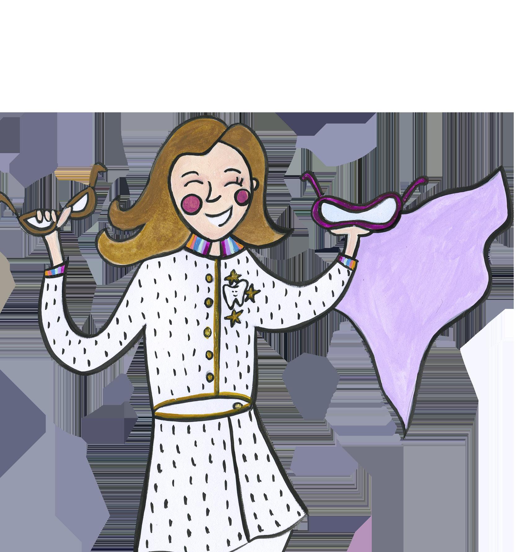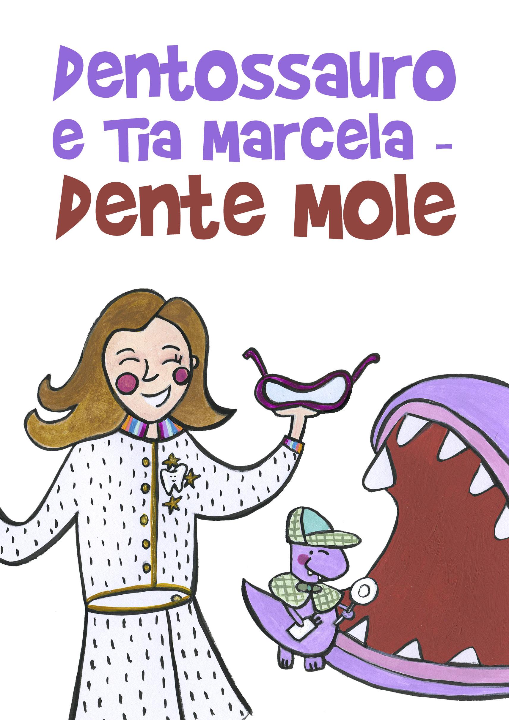 A tia Marcela estava Com seu jaleco vestida E o Dino ficou pensando Que ela mantinha escondida Sua capa de heroína... Mas que dentista sabida!