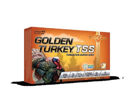 Dense patterns, deep penetration, and long-range performance combine for the ultimate tungsten turkey hunting load. Fiocchi’s Golden Turkey TSS brings performance head and neck above the rest. Three-inch offerings in 12-gauge, 20-gauge, 410 bore and now 28-gauge deliver hard-hitting knockdown power using the finest 18 g/cc tungsten shot and most consistent patterns on the market. The Fiocchi product development team has developed a true, high-grade load proven effective against the toughest of birds. Avid turkey hunters know the Fiocchi Golden Turkey TSS difference.