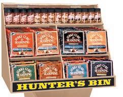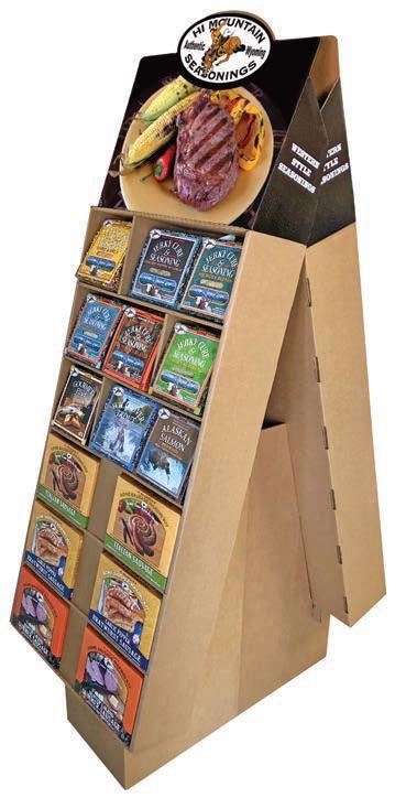 The Spring side has grilling, roasting, and smoking covered with fast-moving bottle seasonings. The Fall side holds Jerky and Sausage Making Kits. The header has hooks to add Finishing Sauce packets if you choose.