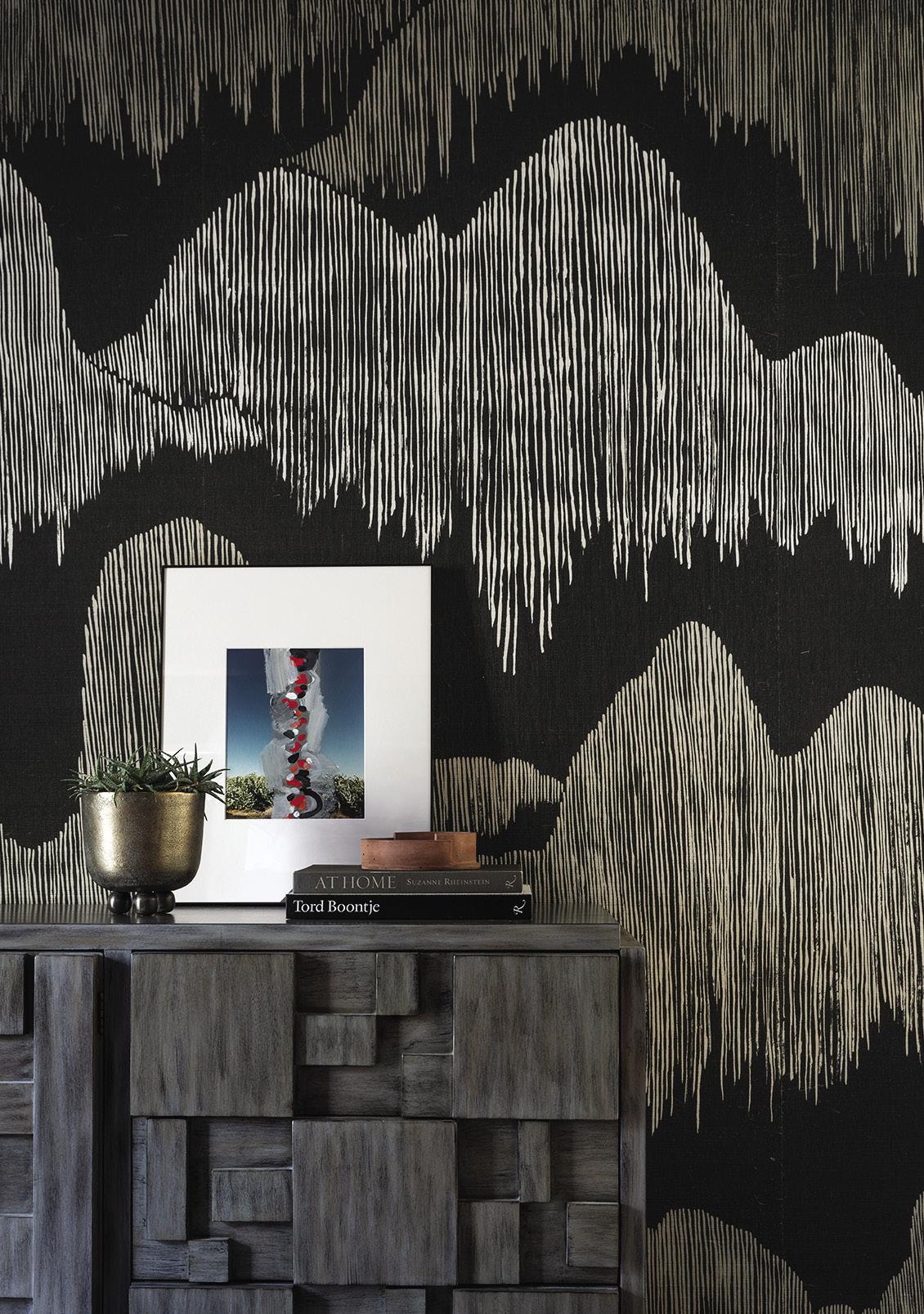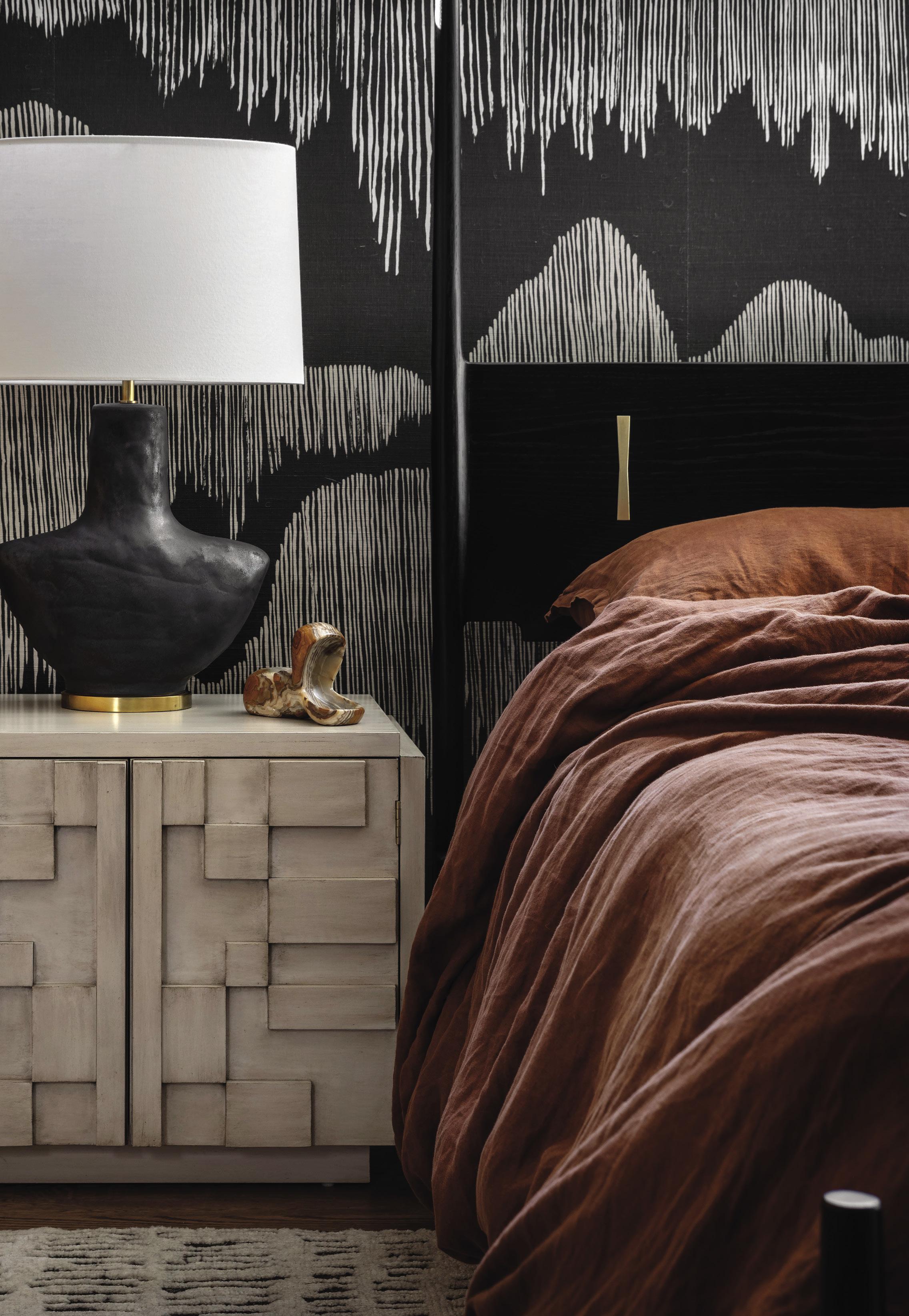 In the primary bedroom, Dirkse evoked the glam ’70s with dark tones, brassy accents, and persimmon-colored bedding. The nightstand is vintage, and the rug is from Kush. OPPOSITE, FROM TOP: In the powder room, another bold wallpaper—Jupiter 10’s Atlanta—is a graphic statement. Kelly Wearstler’s Cascadia wallpaper in Noir makes for a dramatic backdrop in the primary bedroom.