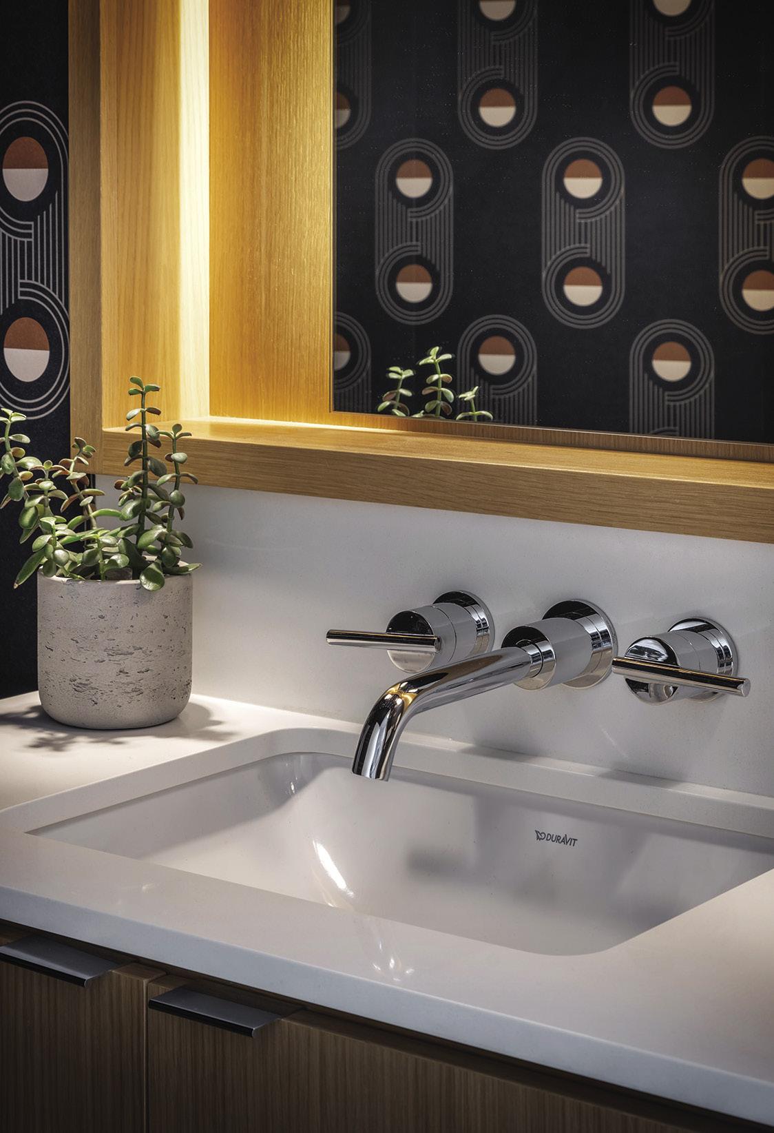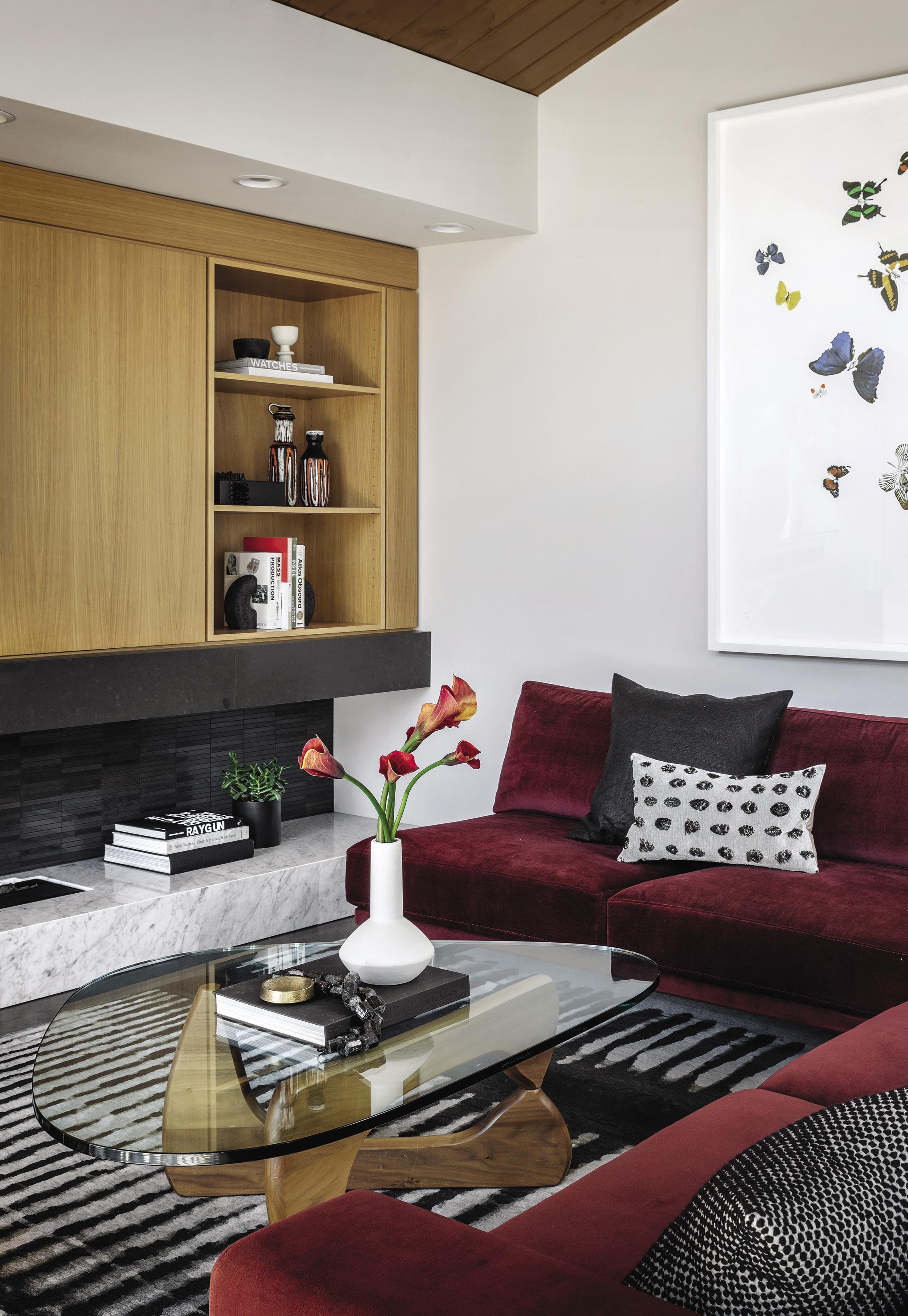 In the primary bedroom, Dirkse amplified the pattern and texture with a graphic wallpaper and area rug, but kept them from overwhelming the space by keeping tones black and white. A media room embraces the midcentury theme with an orange Womb Chair, designed by Eero Saarinen in 1948 at Florence Knoll’s request for “a chair that was like a basket full of pillows.” A Damien Hirst butterfly artwork hangs above a Holly Hunt sectional covered in a cranberryhued fabric. The Noguchi coffee table is a beloved piece that the couple already owned— its timeless silhouette and simple materials encapsulate the spirit of the project, which seamlessly blends eras and styles to create an elevated, chic, and livable home.