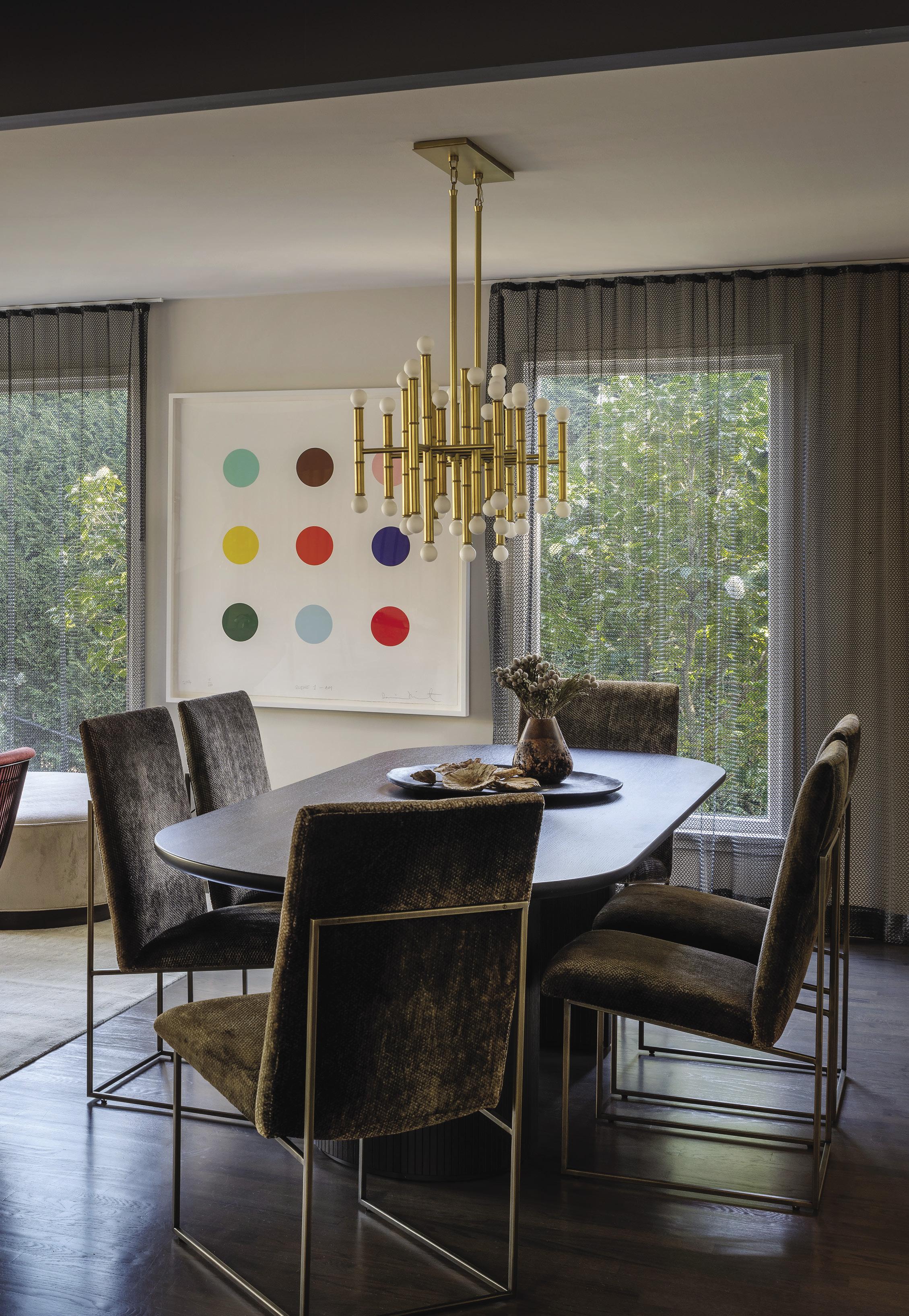 A dining area adjacent to the living room features a sleek black Gubi table with LawsonFenning chairs upholstered in a chocolatecolored soft-textured velvet. A gold Jonathan Adler chandelier, which the couple already owned, completes the look, which is reminiscent of a ’70s-era lounge. Dirkse installed a smoked mirror above the built-in sideboard—an unexpected choice that ended up being a favorite of Amy’s. “There’s a sexy cheekiness to it,” she says. “I was skeptical at first but fell in love the second it was installed. It’s a creative way to dress up a blank wall space other than with wallpaper, paint, or art. It also adds an elegant dimension to the space.”