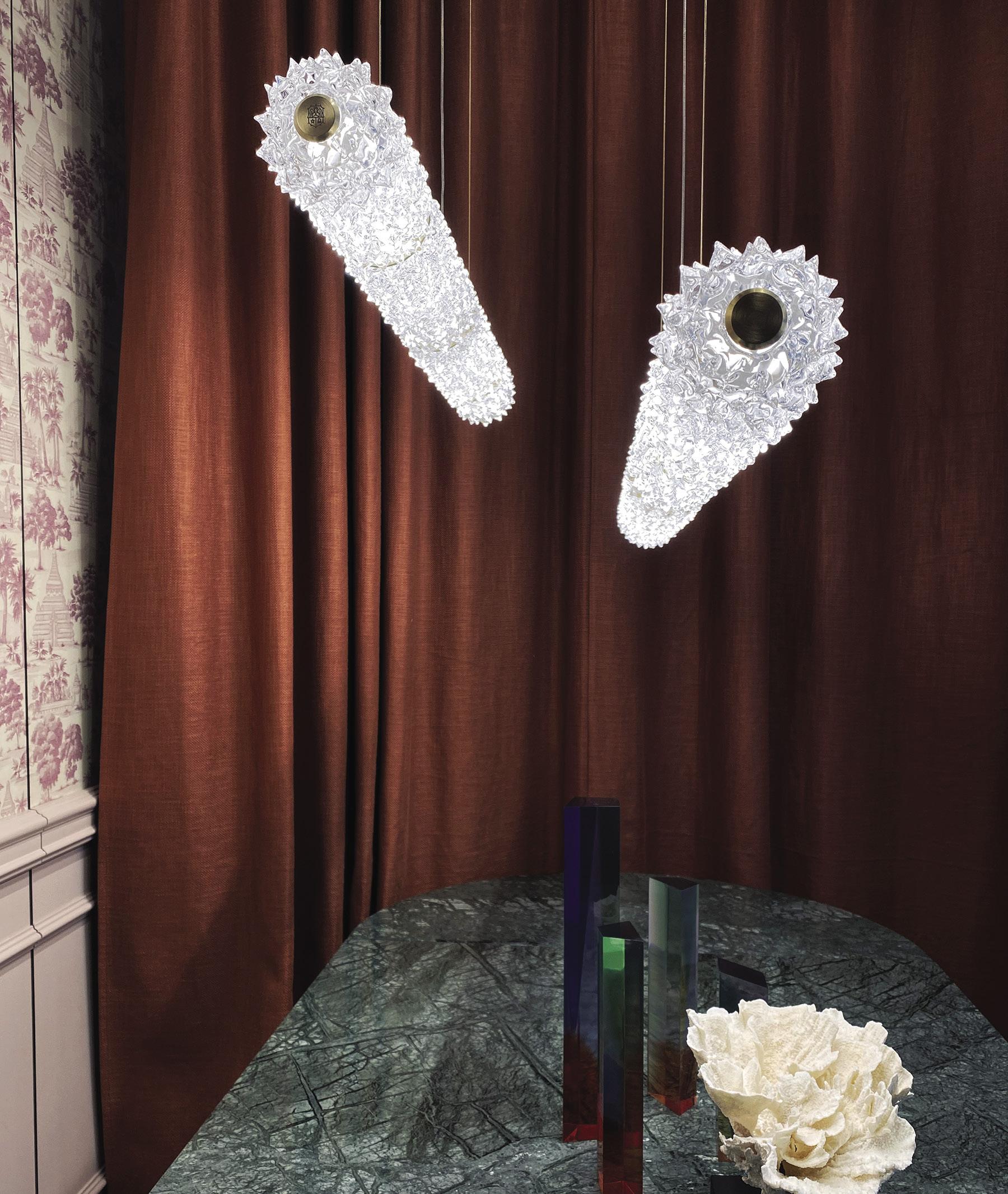 “Impressed by the brand’s 700-year history, I immersed myself in the many skills that the master glassmakers at Barovier&Toso have known how to preserve for centuries. For this first collaboration, my attention naturally turned to the “rostrato” technique [featuring individually pulled spikes of Venetian crystal]. Invented by Barovier&Toso in the 1930s, this technique fascinated me not just for its unique, timeless, and recognizable style, but also for how it divides light in a particularly incomparable way.” —Philippe Nigro, designer